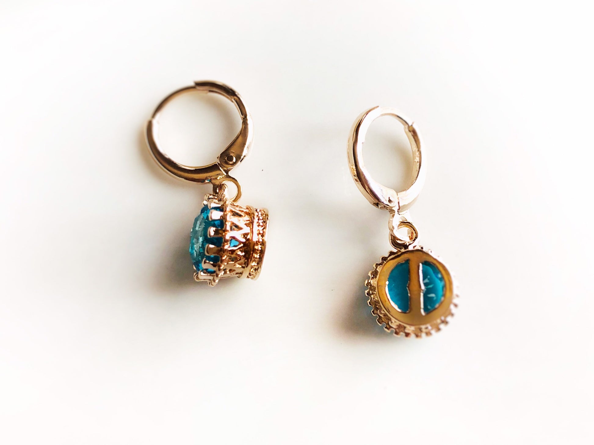 Small 8mm bezel dangle earrings. The brilliant cut created blue topaz gemstones are secured in intricate bezel settings and exude their beautiful medium blue. Set in 14K rose gold or 18K white gold over brass, lead and nickel free