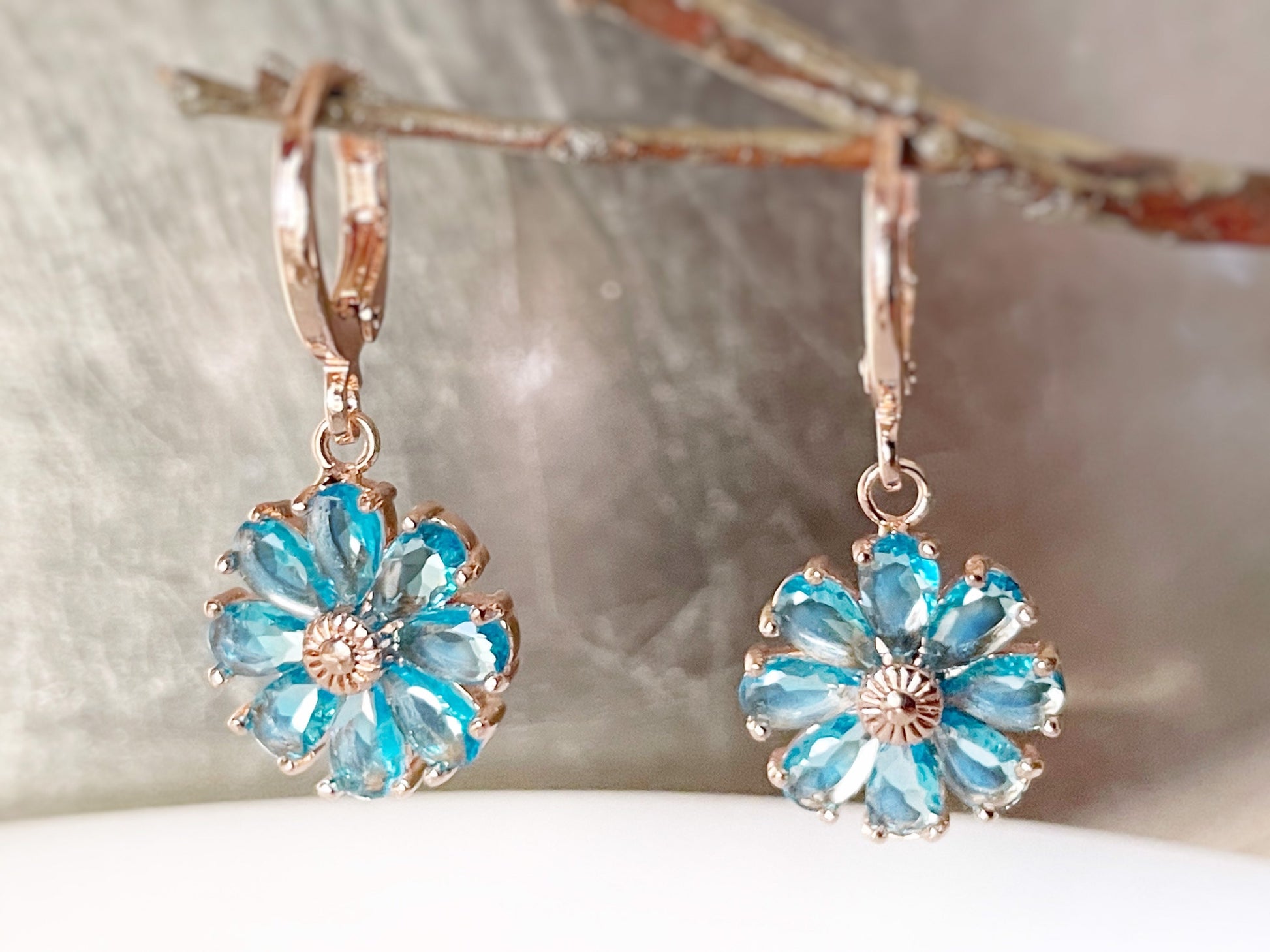 Blue topaz daisy flower 2pc jewelry set casted in 18K white gold, 14K rose gold or 14K yellow over brass. These created blue topaz gemstone daisy flowers are 0.5 inch wide.