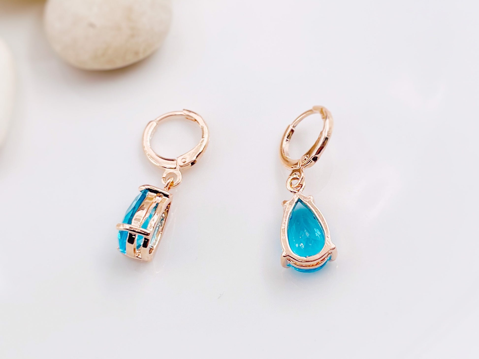 Blue topaz gemstone huggie dangling earring in 18k white gold, December birthstones, blue earrings, gift for her, gift for mom
