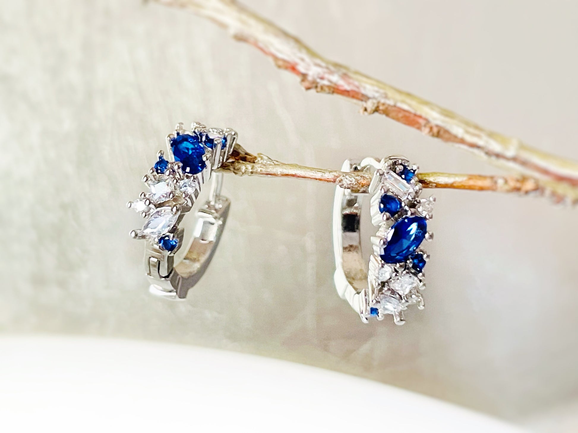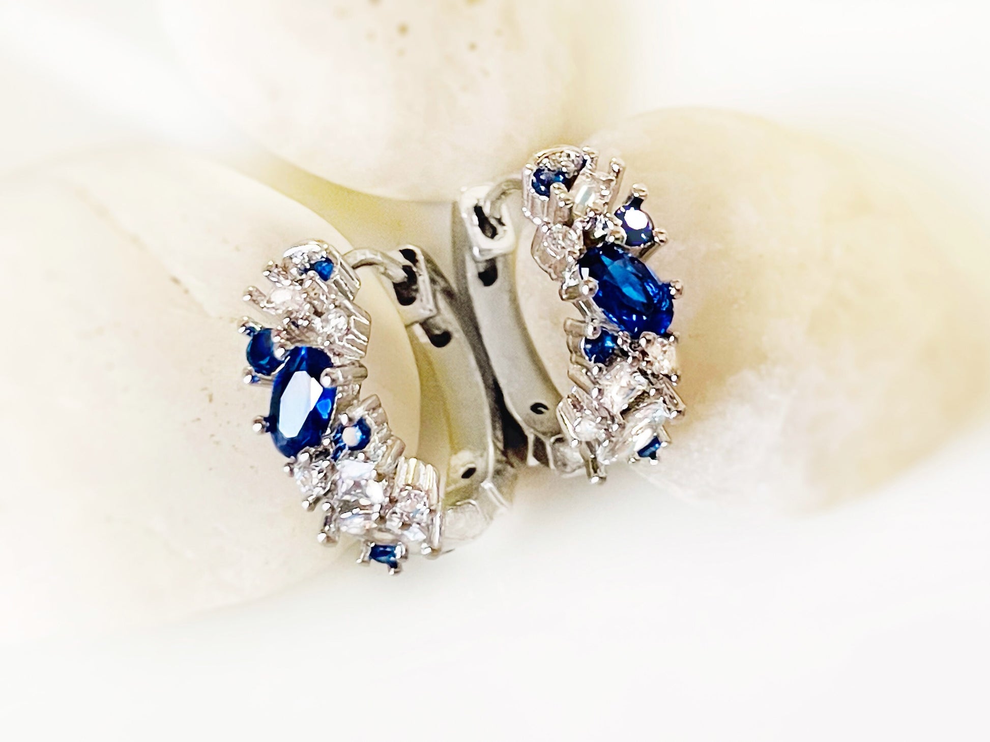 Blue and white sapphire hoop earrings with various cut of created stones casted in 18K white gold plated over brass. These classic hoops are perfect for any occasion. Lead and nickel free.
