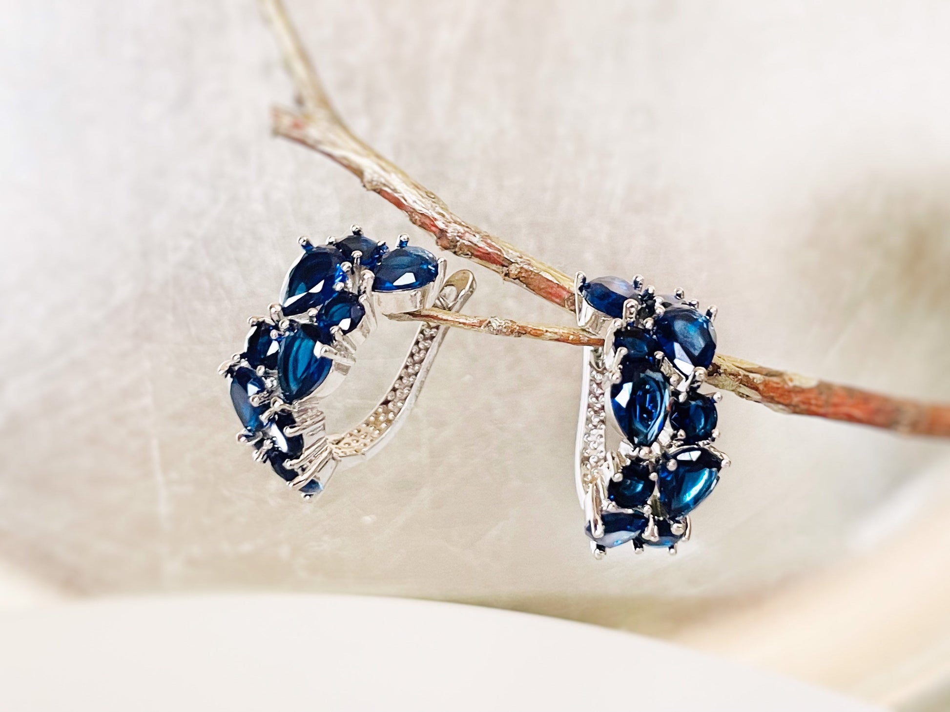 Blue and white sapphire cluster statement hoop earrings casted in 14K gold / 18K white gold plated over brass. These beautiful earrings come in created pear cut blue sapphire and round white sapphire gemstones. Lead and nickel free.