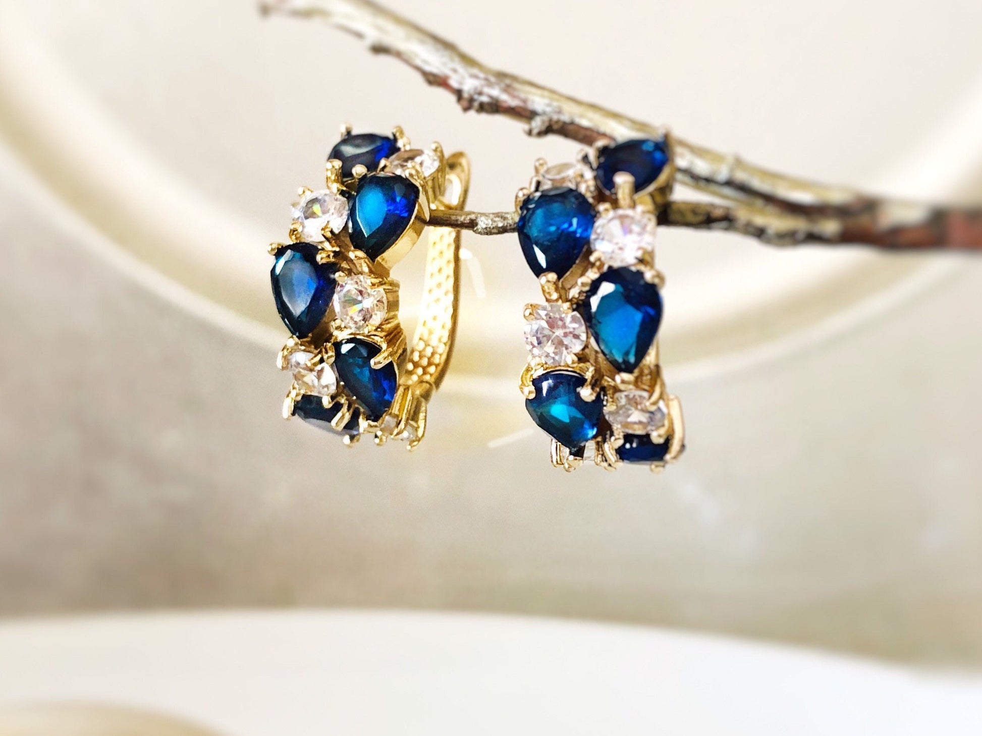 Blue and white sapphire cluster statement hoop earrings casted in 14K gold / 18K white gold plated over brass. These beautiful earrings come in created pear cut blue sapphire and round white sapphire gemstones. Lead and nickel free.