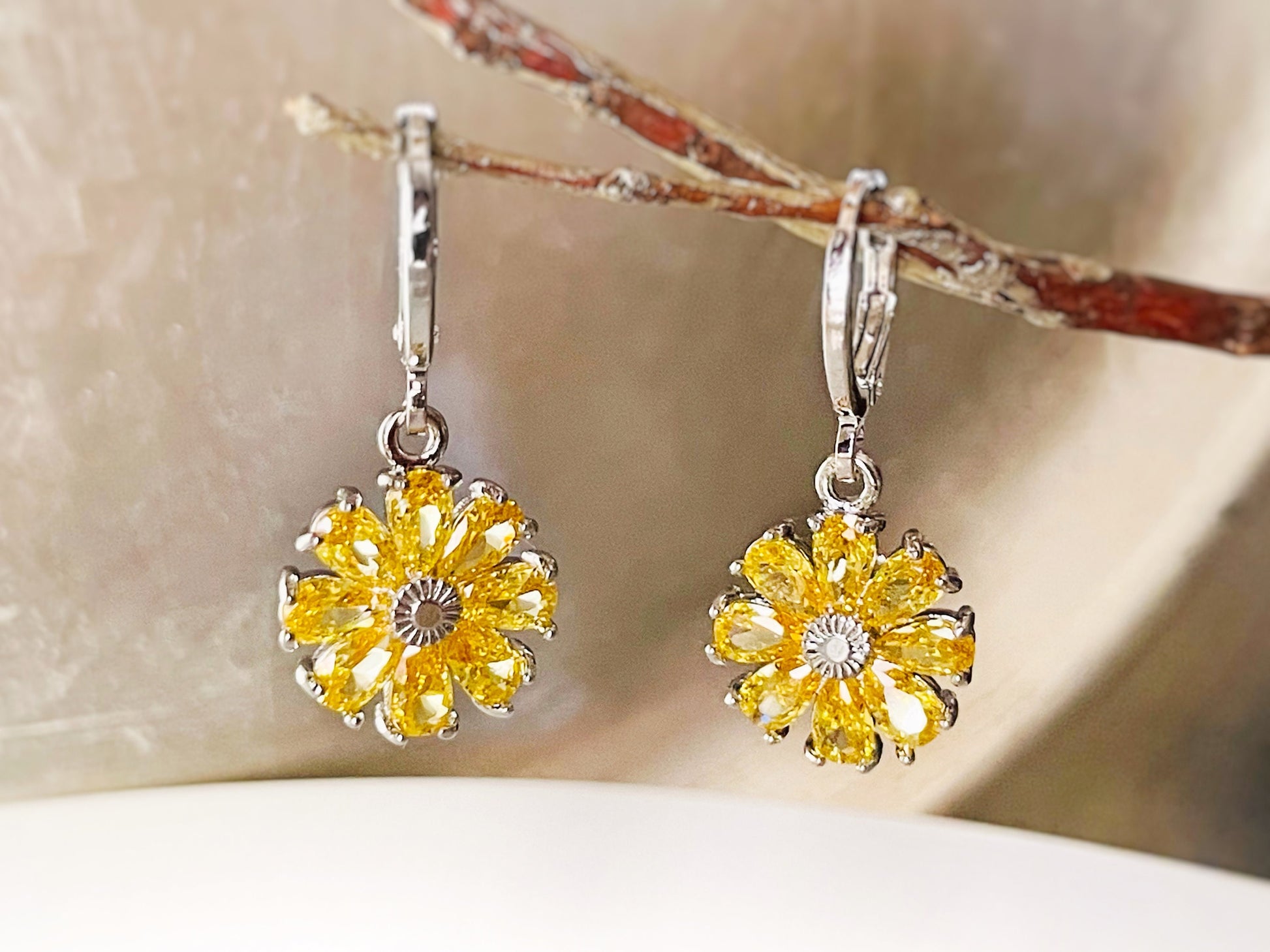 Citrine daisy leverback earrings, yellow gemstone flower earrings, November birthstone earrings, gift for mom, gift for her