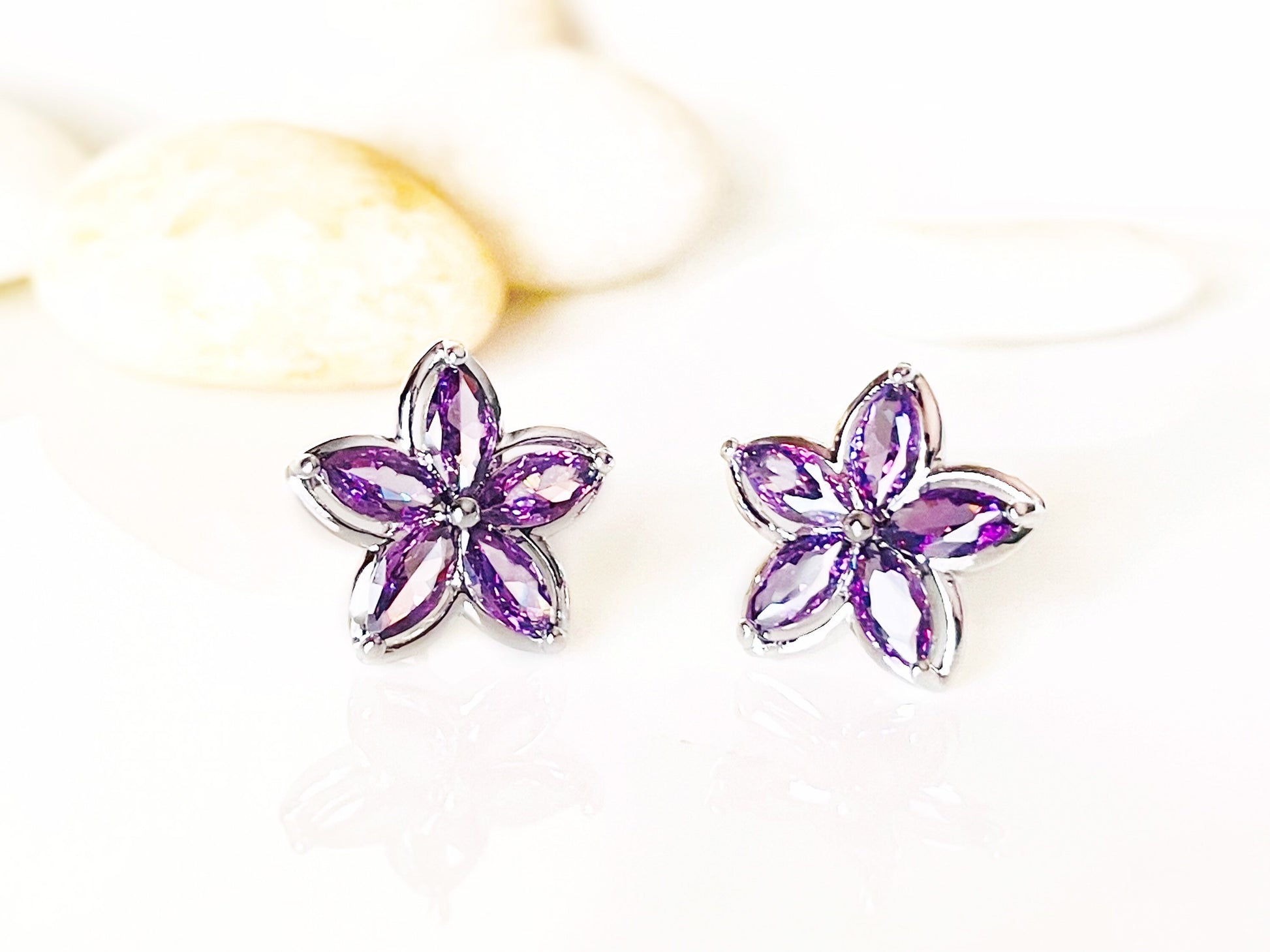 Created citrine flower stud earrings casted in 18k white gold plated over brass. Each flowers stud is 0.55 inch / 14mm in diameter with 7x5mm yellow citrine