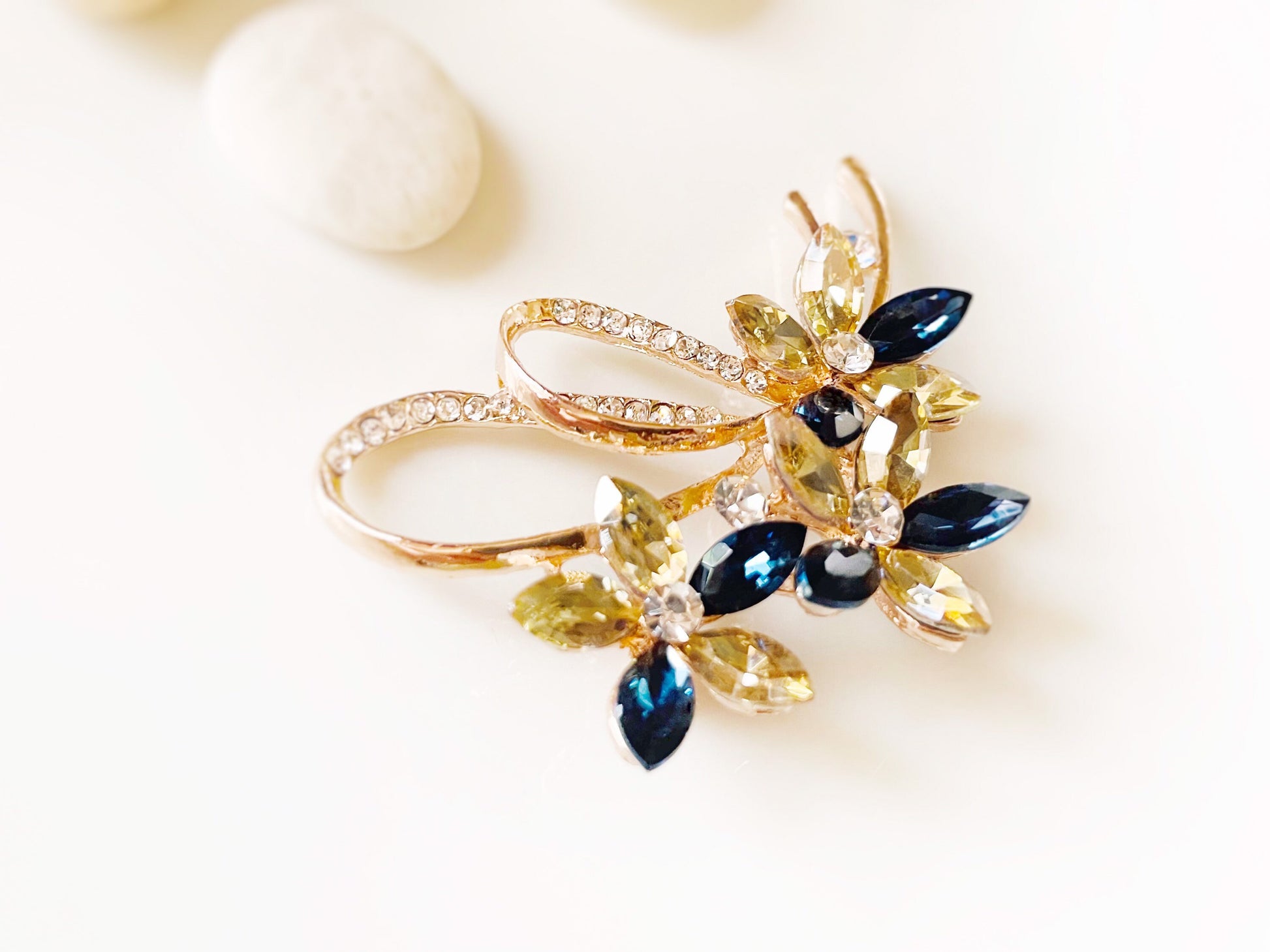 Blue sapphire and white crystal floral bouquet handcrafted in 18k white gold plated or 14k rose gold plated with sapphire champagne and white crystals.