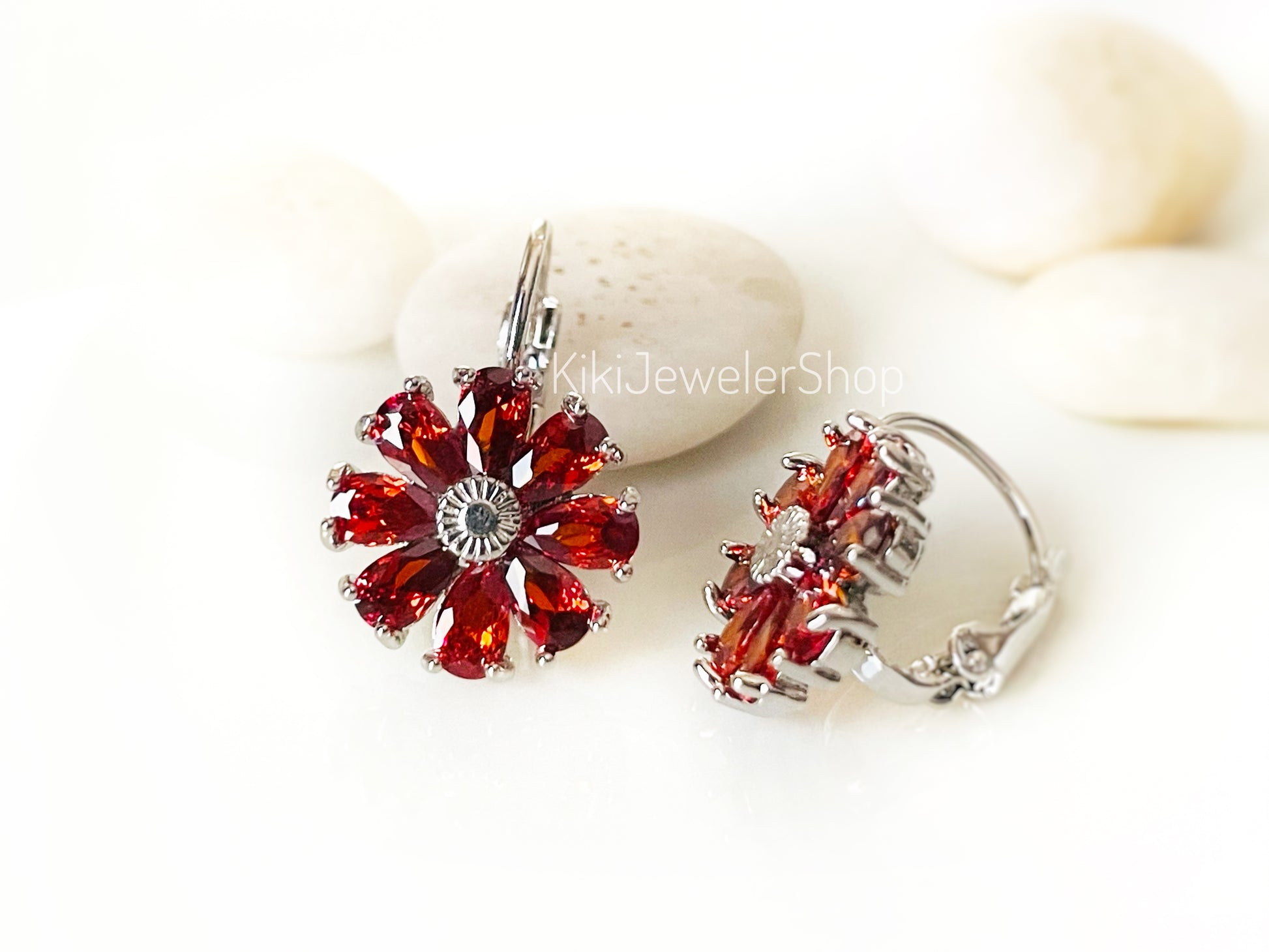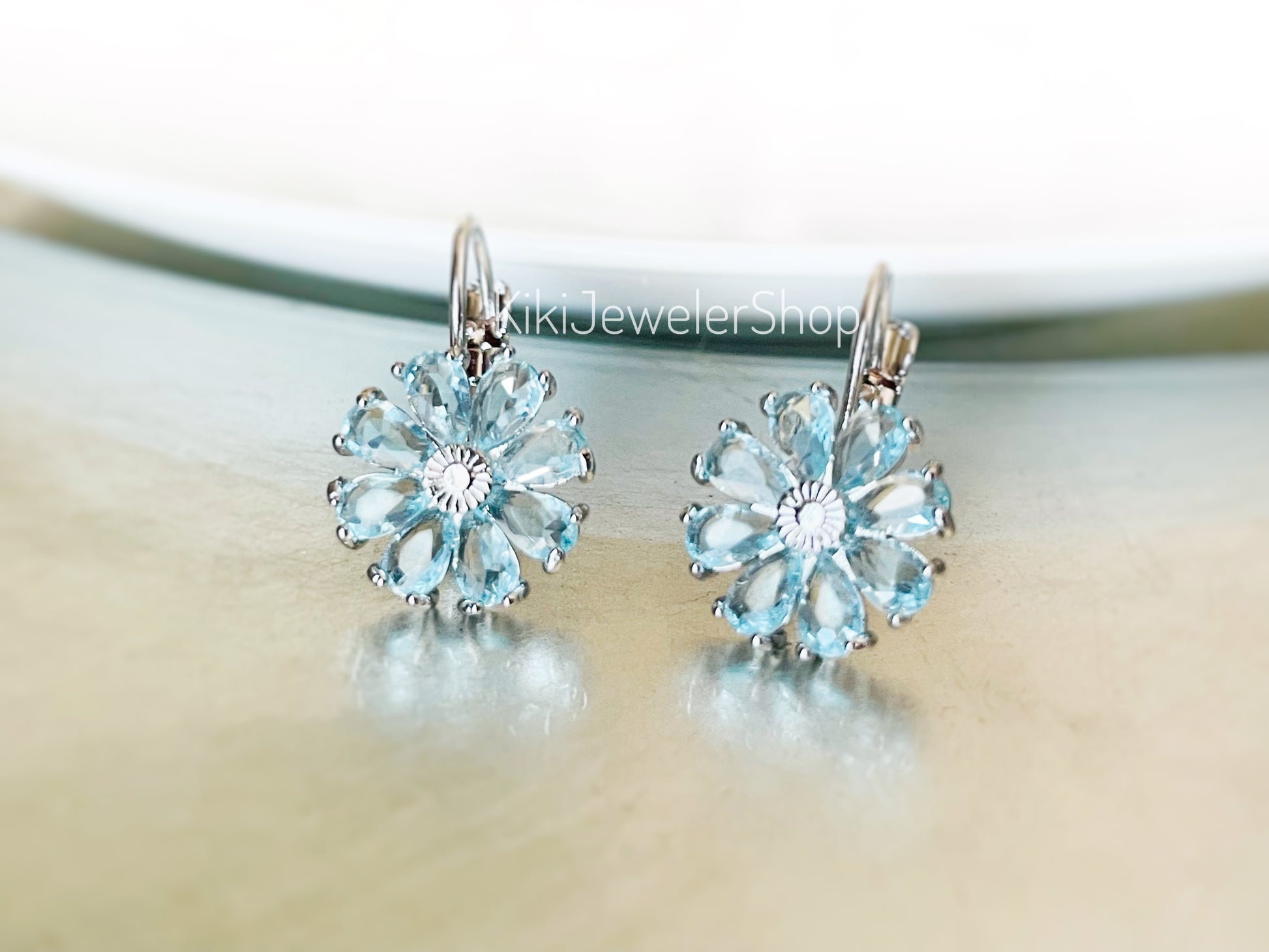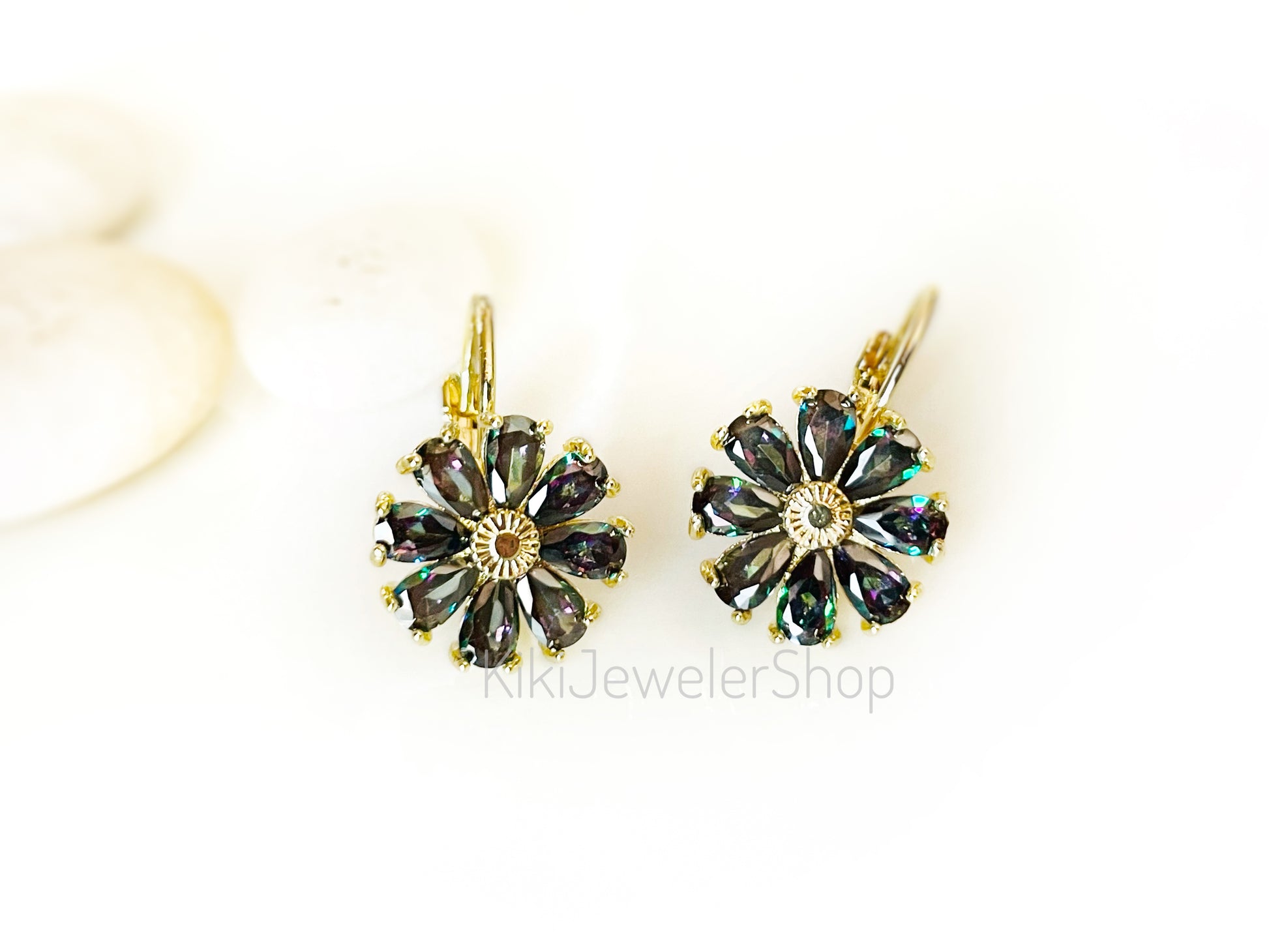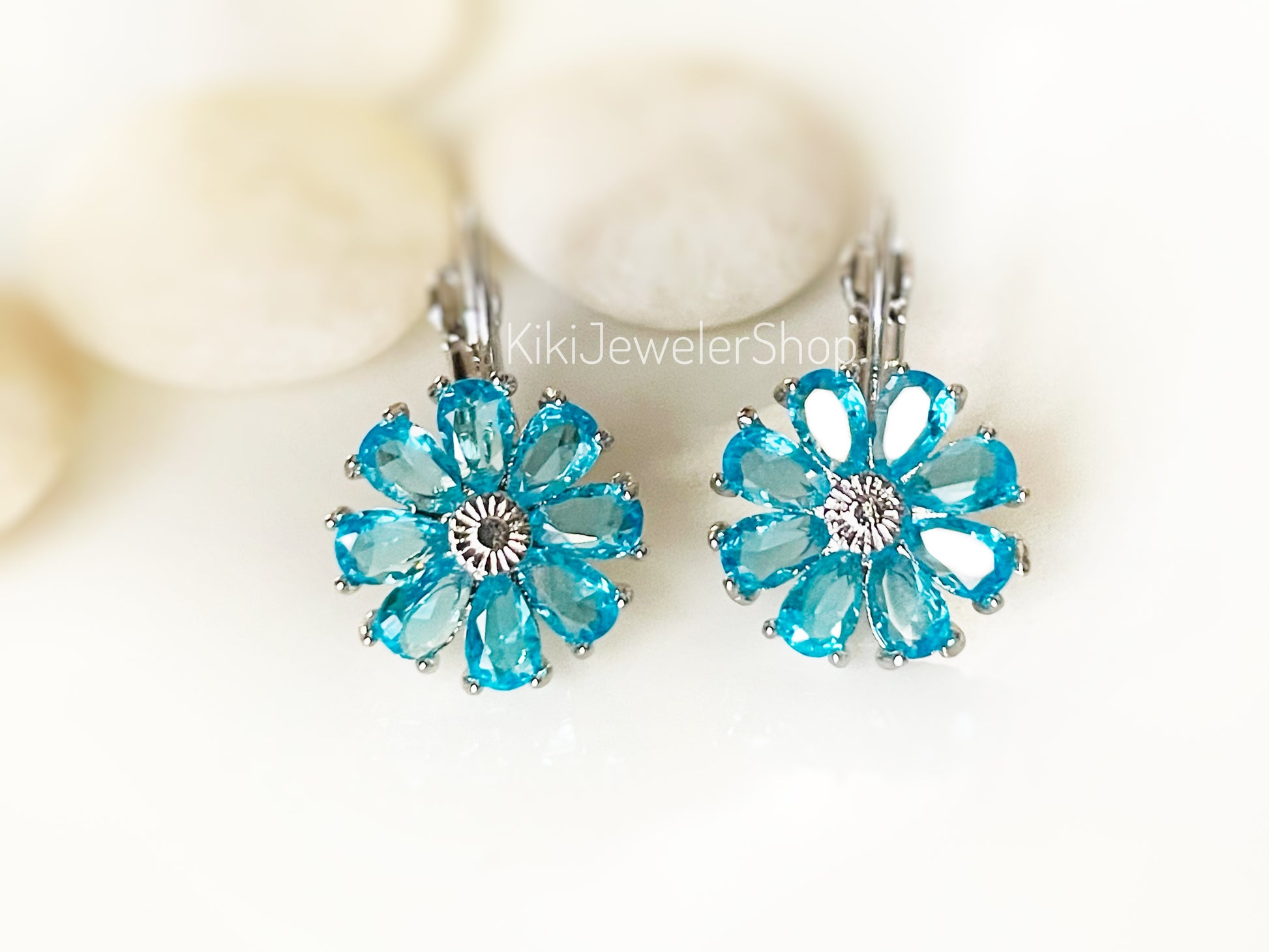 Dainty daisy flower gemstone dangle earrings lever backs. These created gemstone flowers are set in 14K gold and 18K white gold over brass. Each daisy flower has 8 small pear shaped faceted stones with lots of sparkles.
