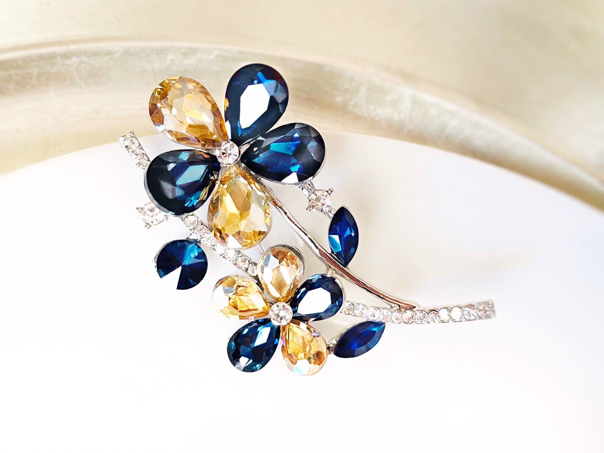 Sapphire blue and champagne fancy crystals double flower bouquet brooch handcrafted in 18k white gold plated. Small white crystals added extra sparkles to this beautifully designed statement pin…