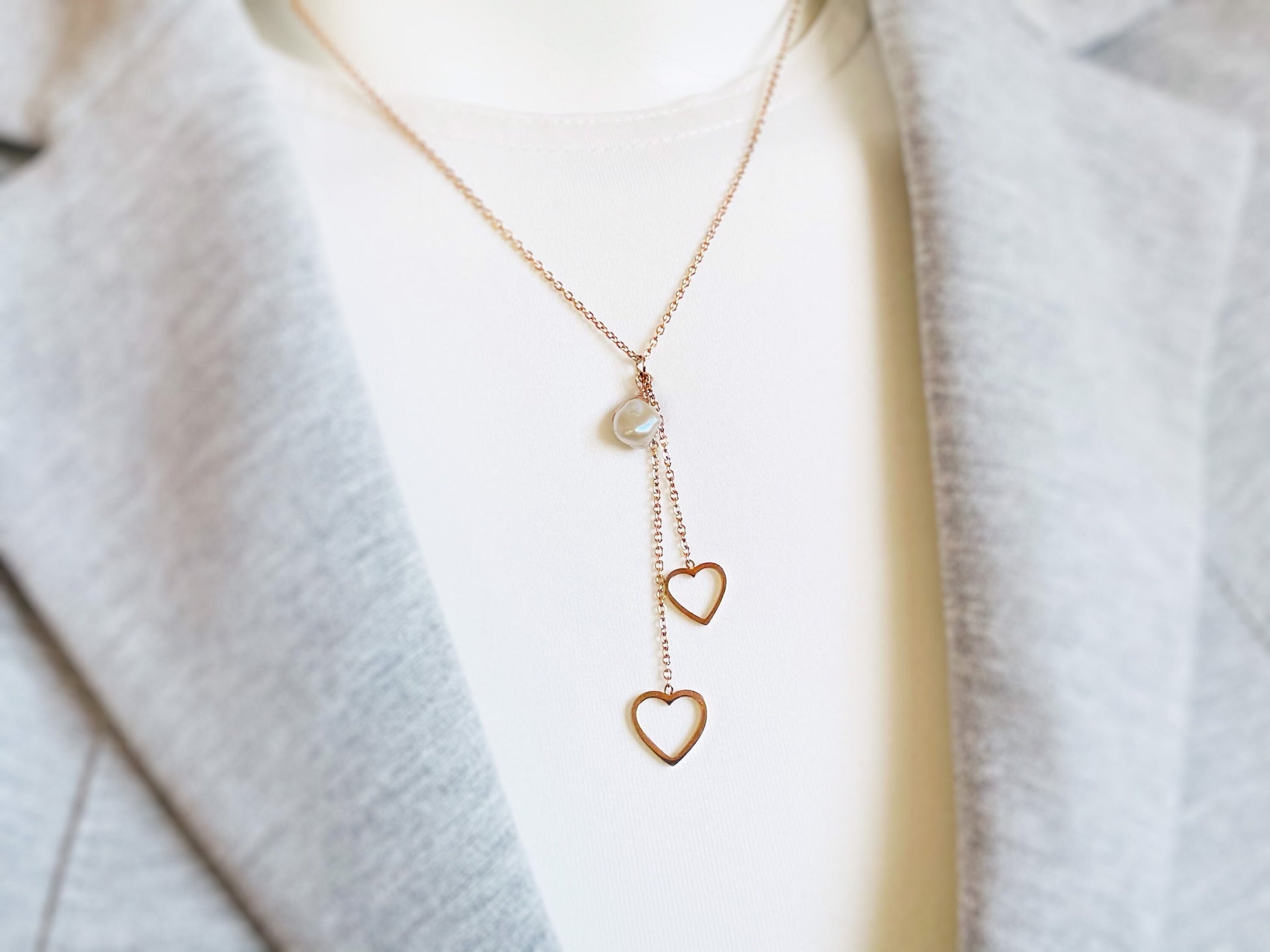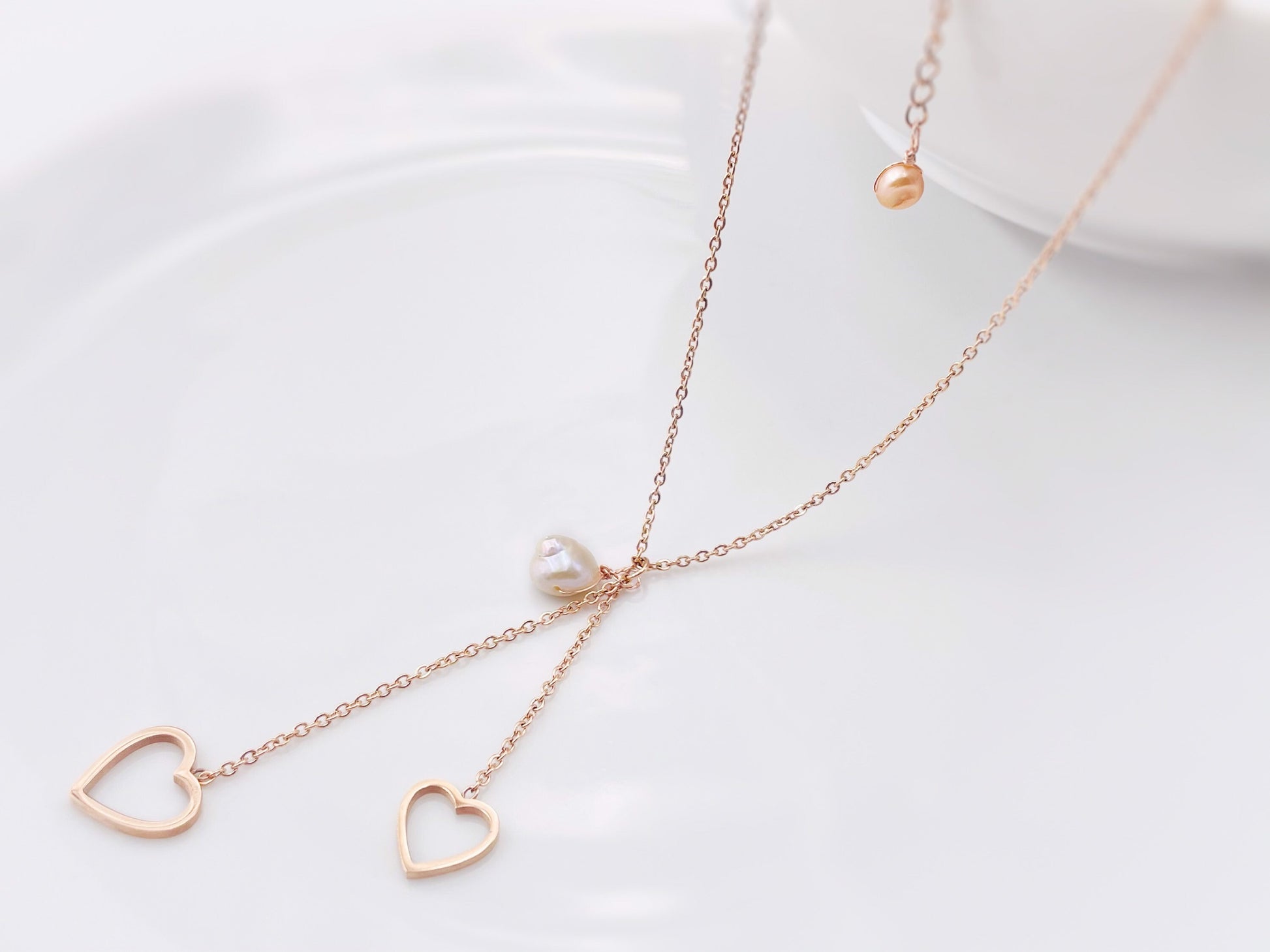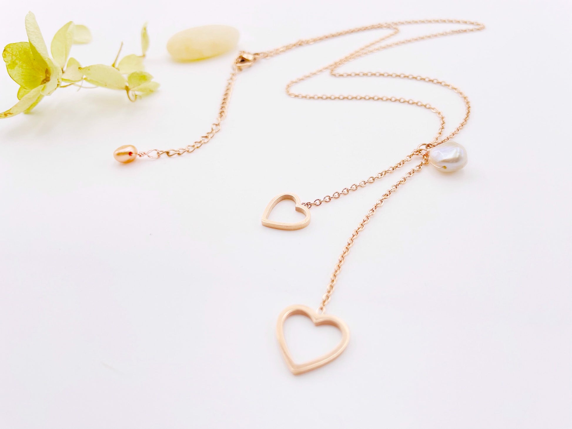 Double heart pearl lariat necklace in 18K rose gold, baroque pearl Y necklace, valentines gift, gift for her