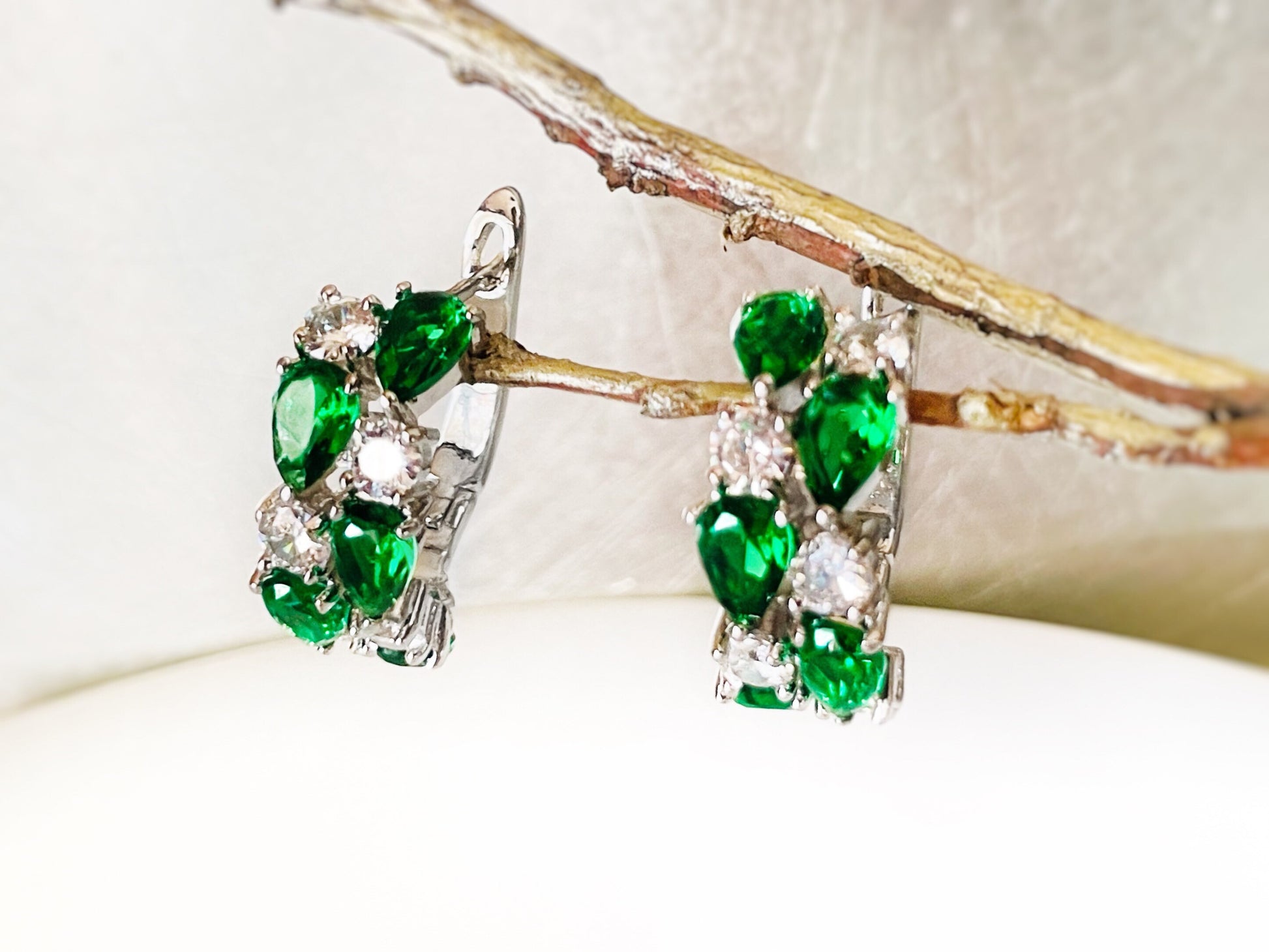 Large Emerald and white sapphire statement hoop earrings crafted 14k yellow gold and 18k white gold plated over brass. These beautiful earrings have created pear cut green emerald gemstones and round white sapphires. Lead and nickel free.