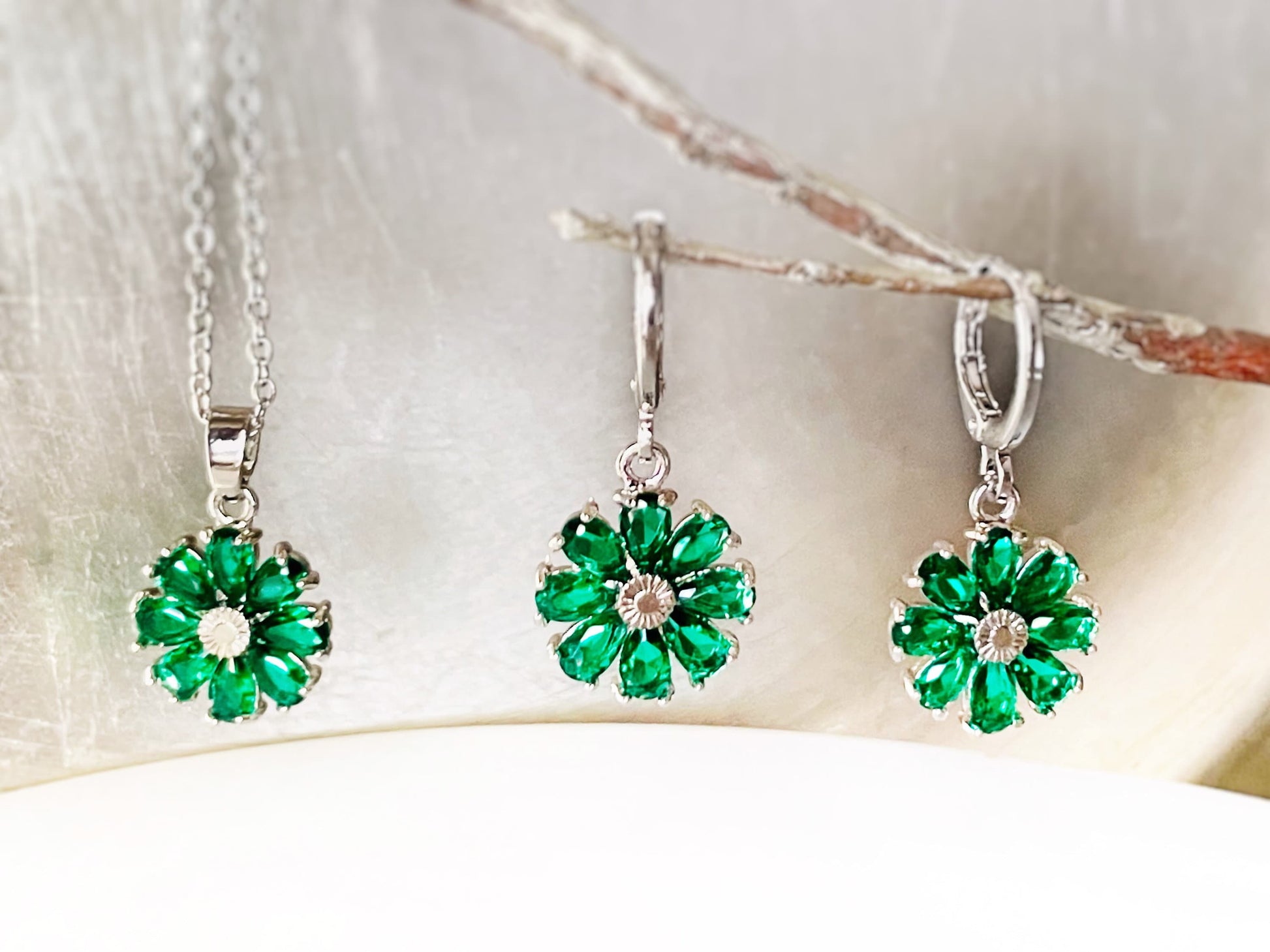 Emerald daisy 2pc jewelry set, green gemstone flower