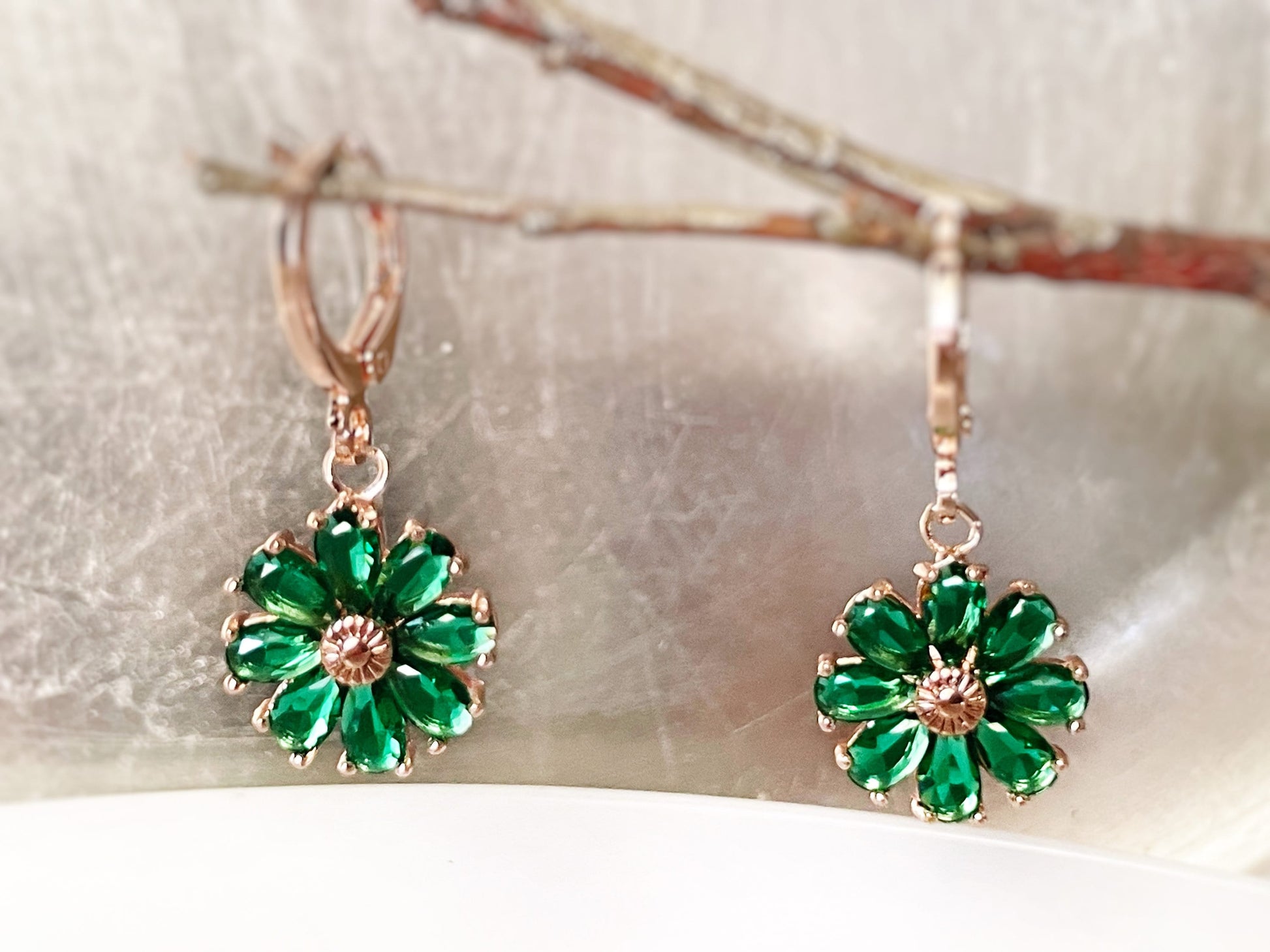 Emerald flower dangle earrings, green daisy flower drop earrings, May birthstone earrings , gift for mom, gift for her