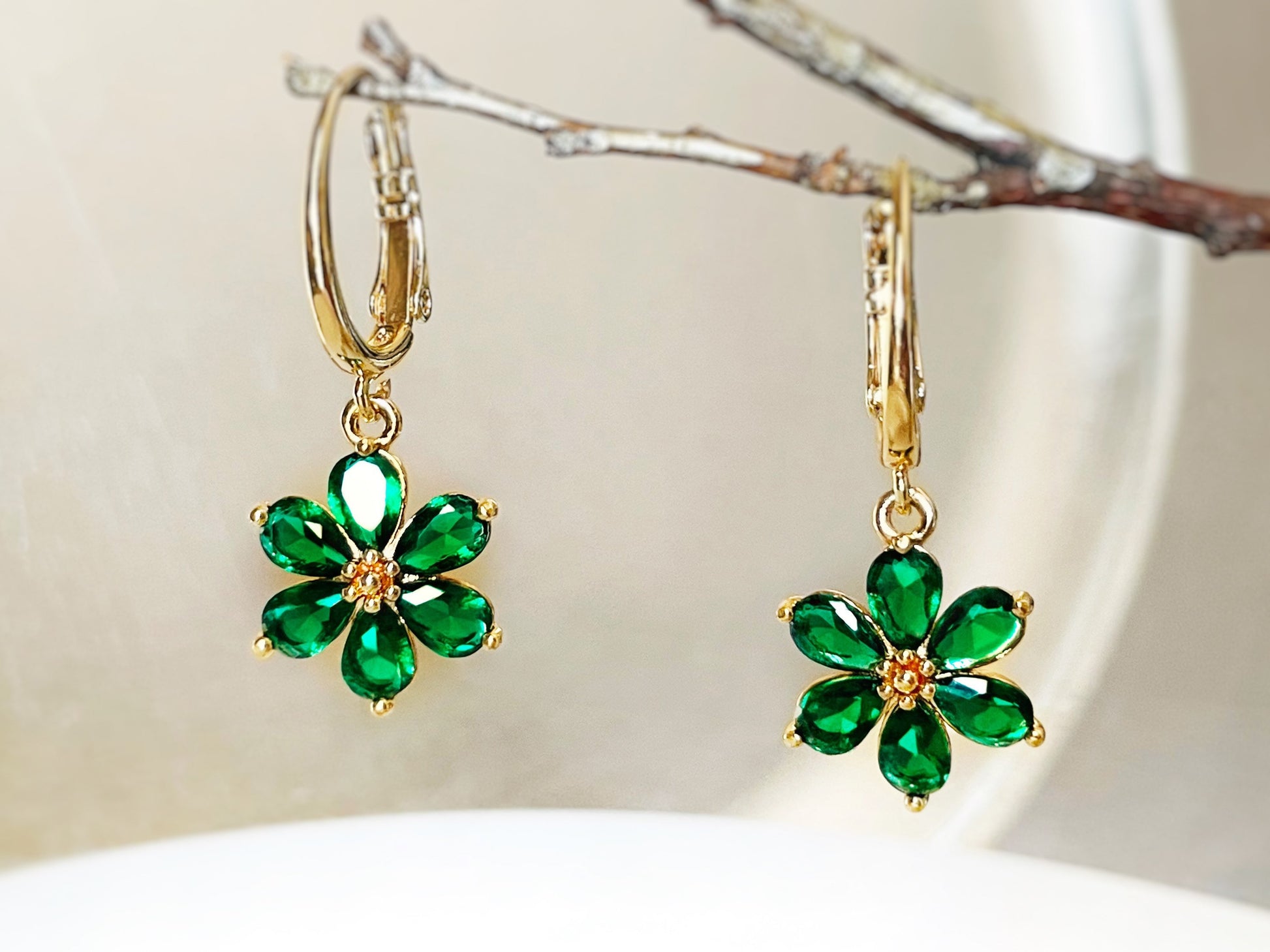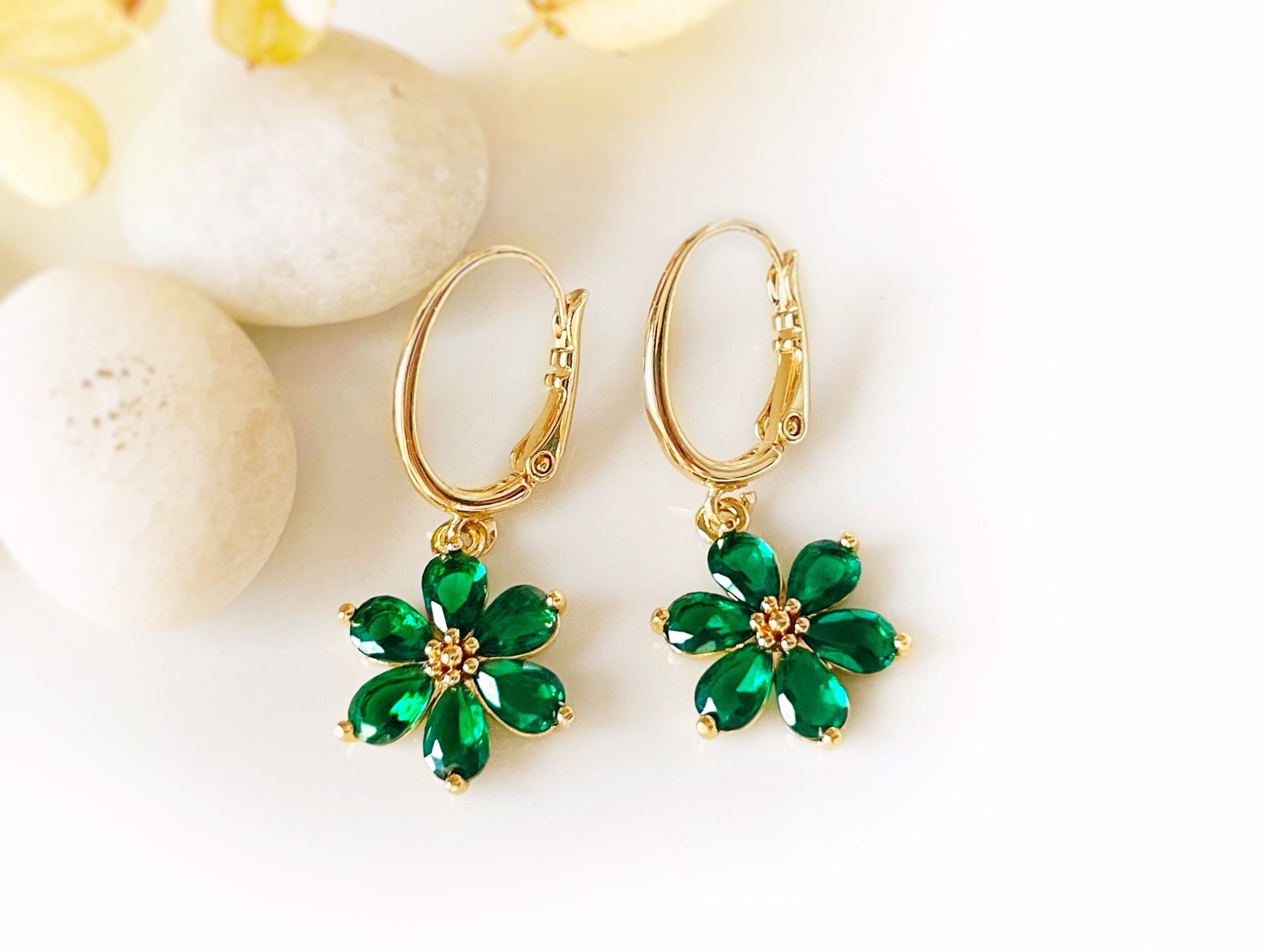 > Emerald green sapphire flower with 5 faceted marquise (7x5mm) cut created green gemstones set in 14K gold plated over brass. Each flower is 16mm /0.6” in diameter dangles from a 20mm/0.75” leverback.