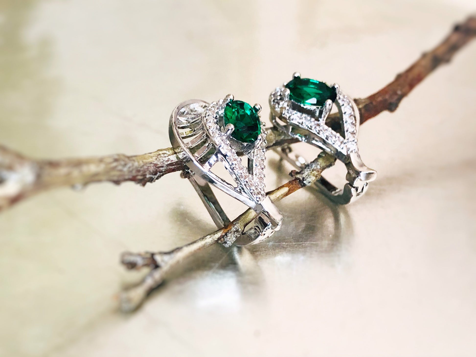 Statement emerald green stud lever back earrings with 7x5mm oval cut center stone and asymmetric white sapphire pave detailing. These uniquely designed earrings are casted in 18K white gold over brass. Theses created gemstones are faceted for maximum sparkle.