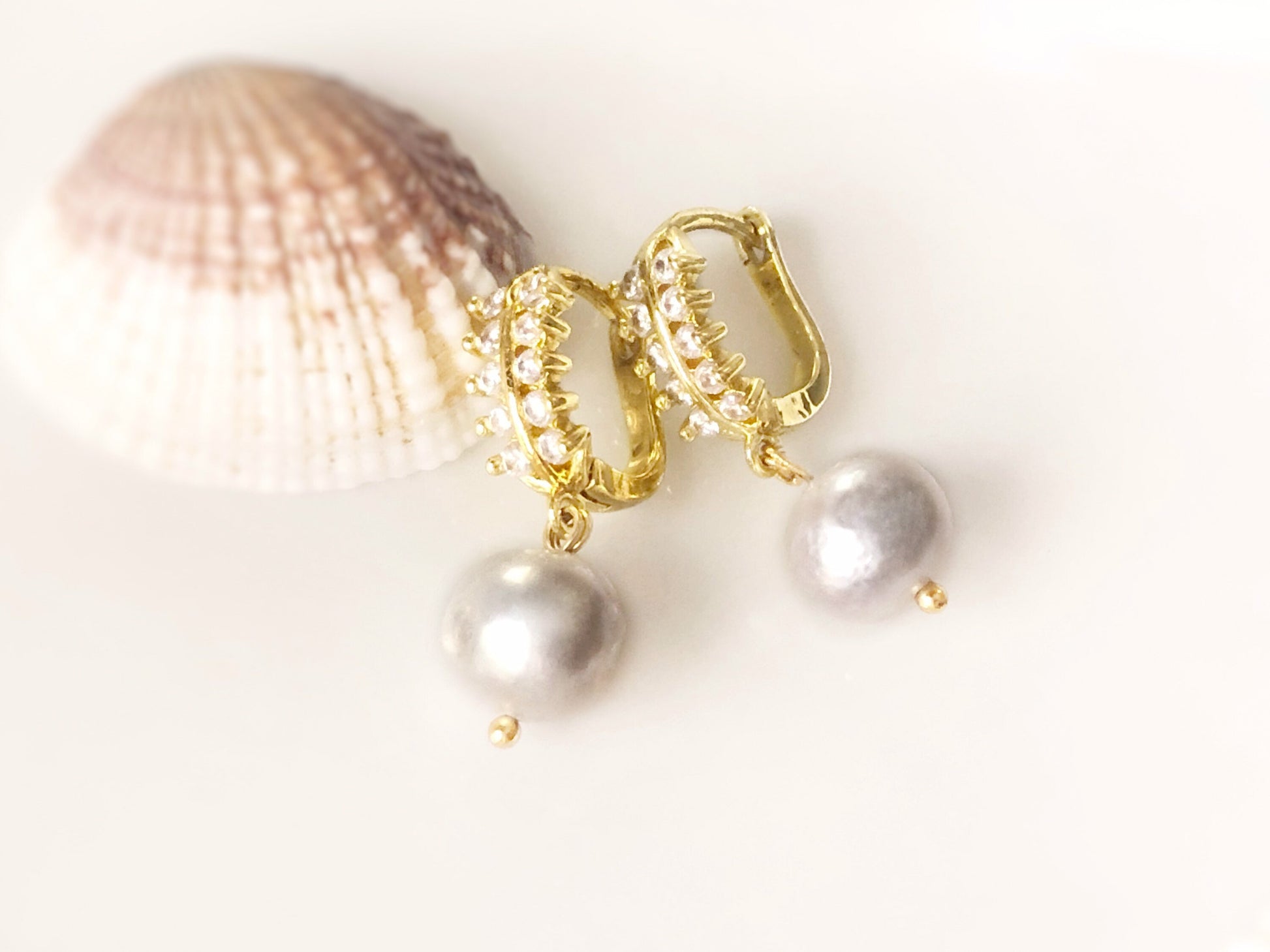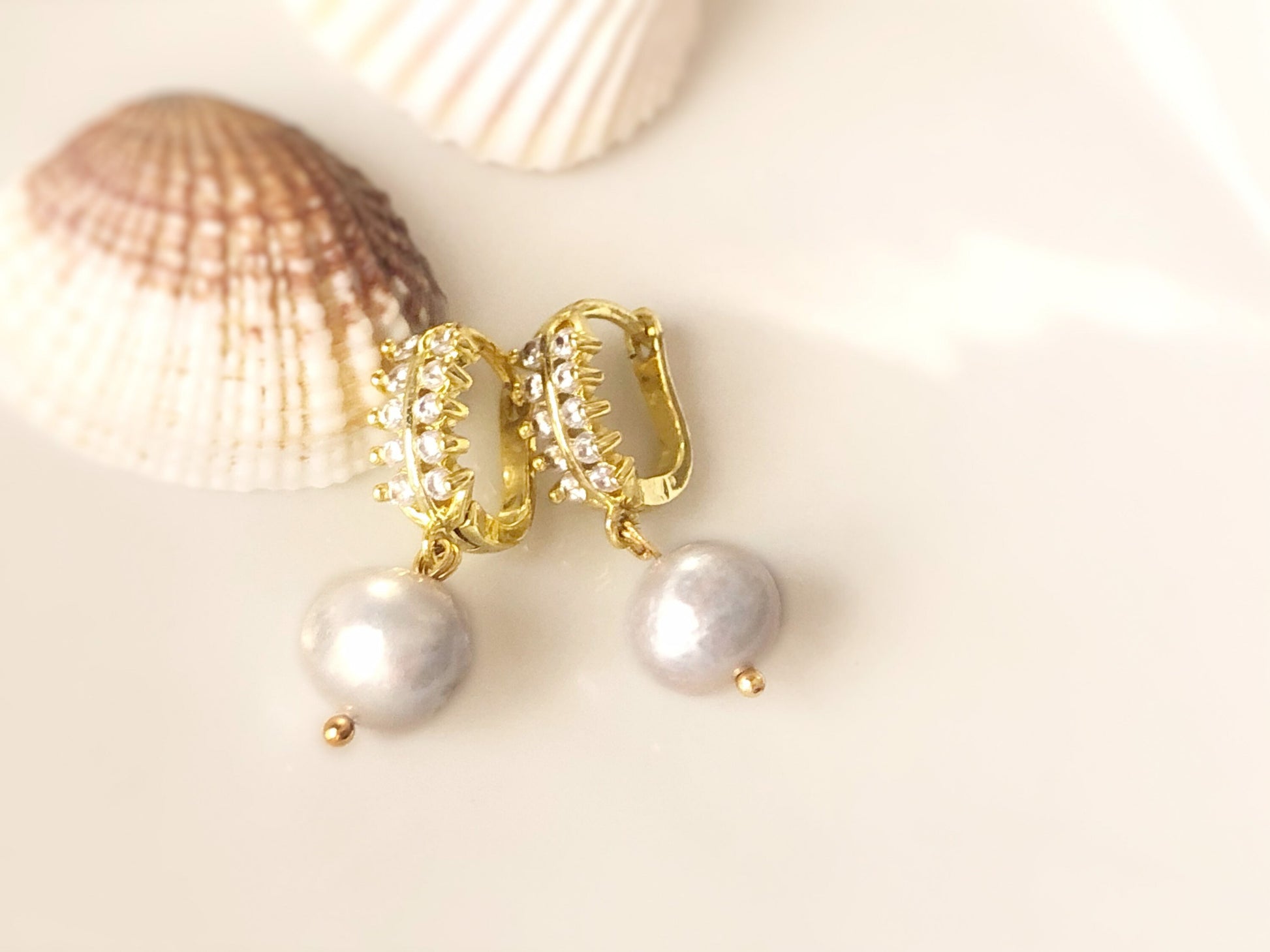 Fresh water genuine pearl dangling earrings. These stunning 9x10mm baroque pearl drop earrings in 22K yellow gold plated over brass are crafted with double rows of simulated diamond accent, prong-set leverbacks.