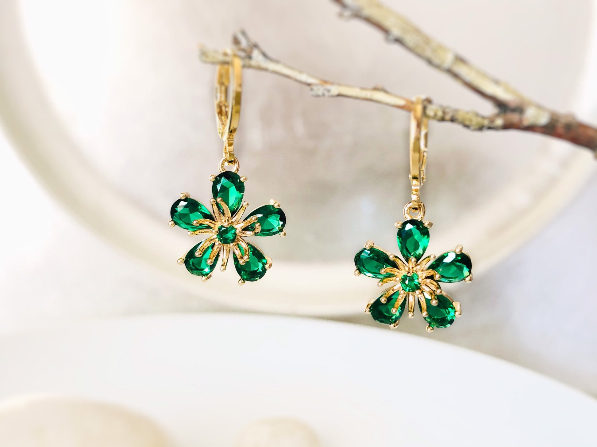 Garnet daisy flower with 5 faceted pear shaped created gemstones set in 14K gold plated over brass. Each daisy flower is 12mm / 0.5 inch drops.