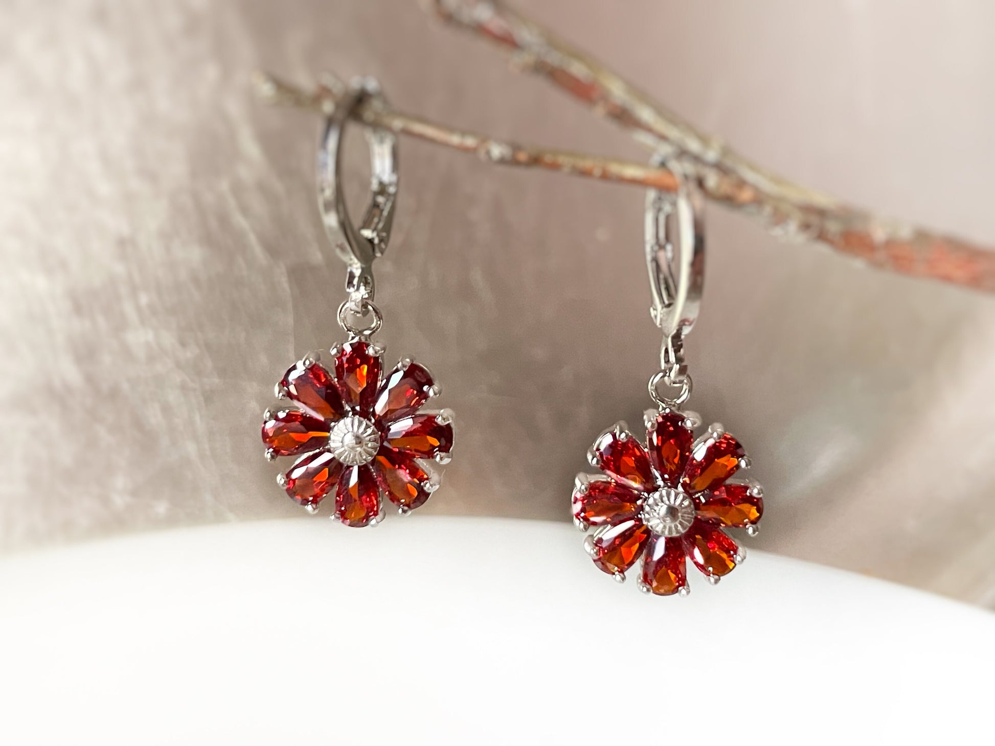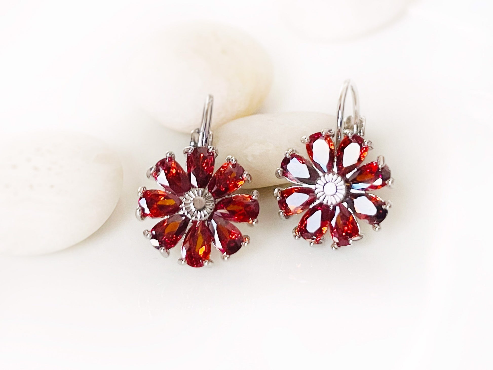 Garnet flower dangle earrings, red daisy flower drop earrings, January birthstone earrings, gift for mom, gift for her, gift for daughter