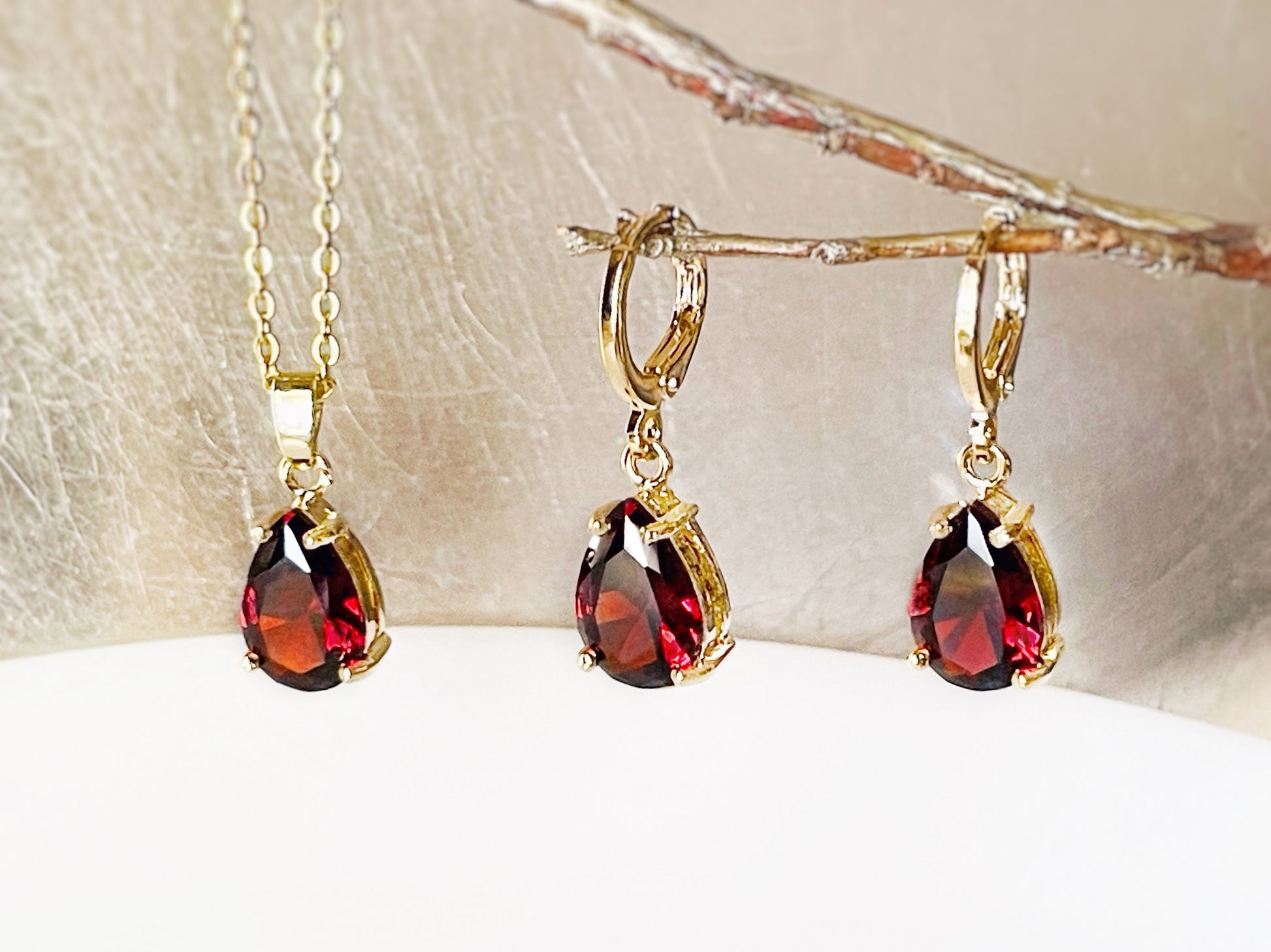 2pc teardop garnet 2pc Jewelry Set, dark red gemstone dangle earrings and pendant necklace set casted in 14k gold, 14k rose gold or 18k white gold plated over brass. Each created red gemstone (12x8mm) is facetet with lots of sparkles. Lead and nickel free.