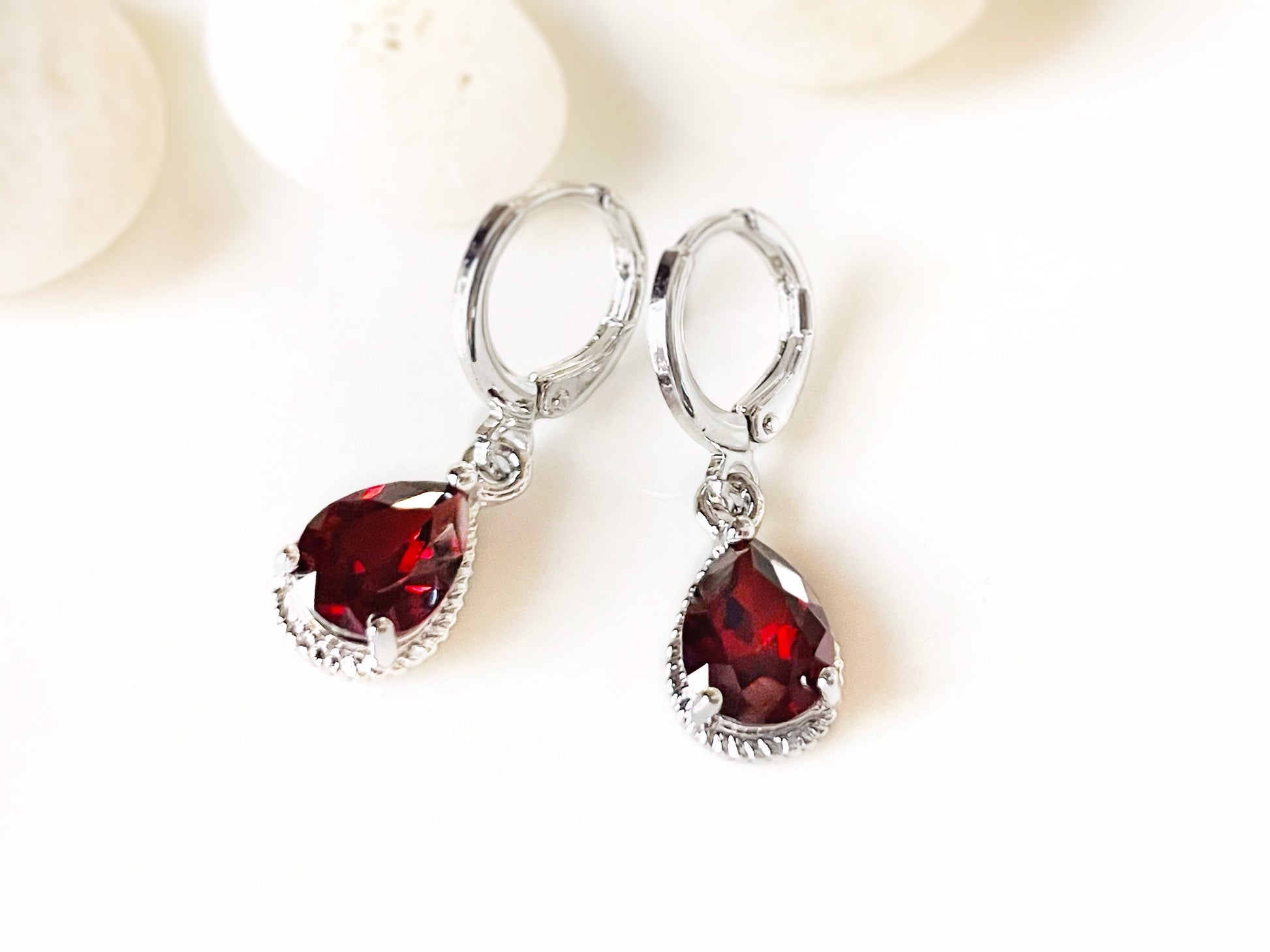 Garnet teardrop huggie dangle earrings 18k white gold, red gemstone bezel earrings, gift for her, gift for daughter, January birthstone
