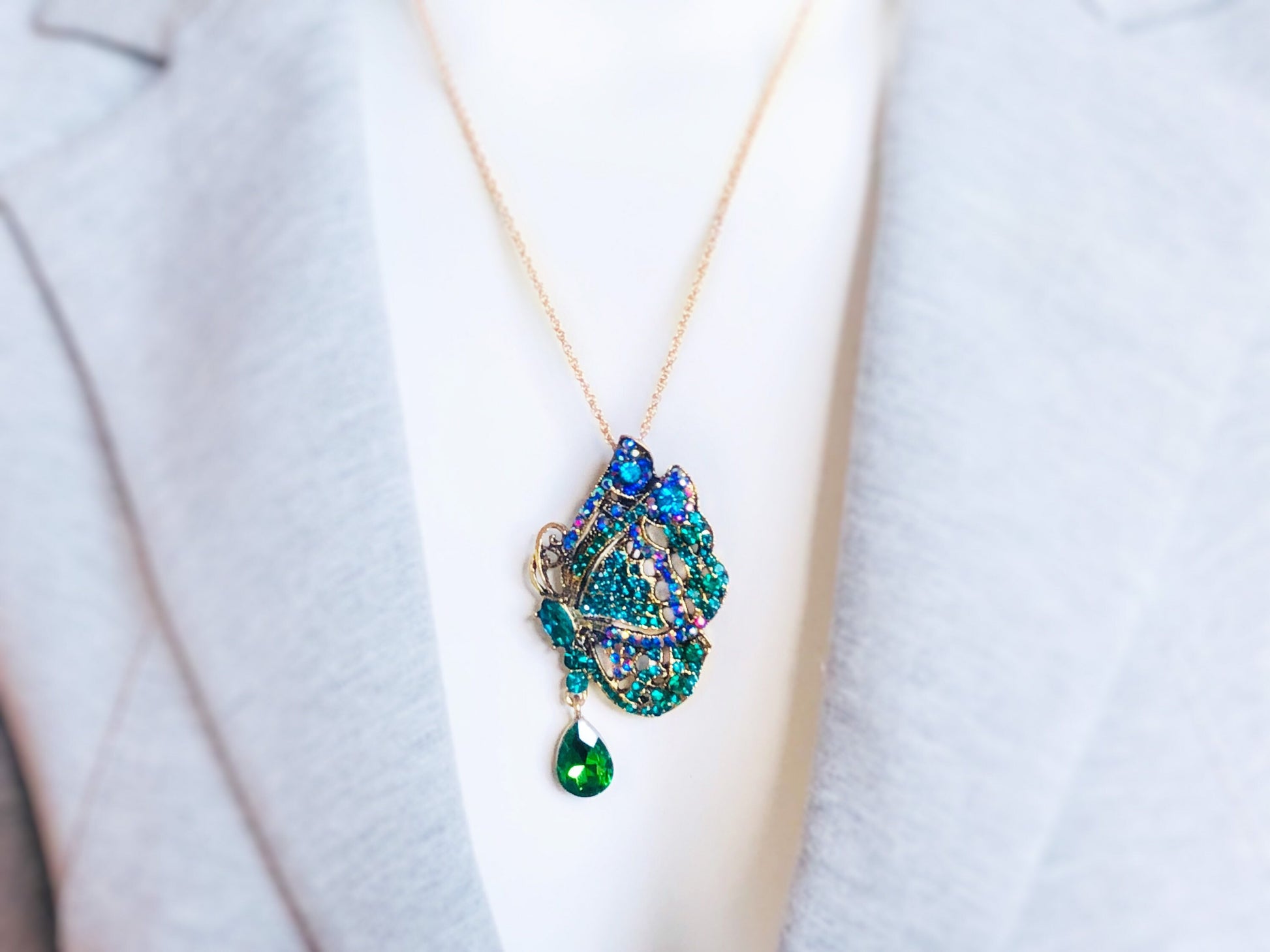 Green blue crystal encrusted butterfly brooch is a statement maker of any outfit in any occasion! The crystals come in different size and colors. This amazing can also be used as a pendant.