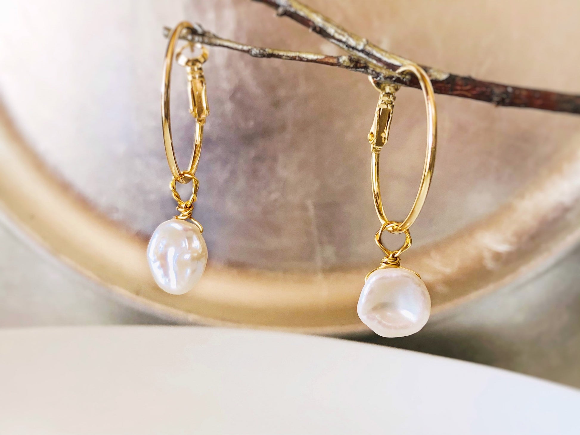 Genuine 10mm high quality, high luster keshi pearls* dangle from 25mm/1” hoops in 14K gold filled over brass. Perfect gift for Mother’s Day!