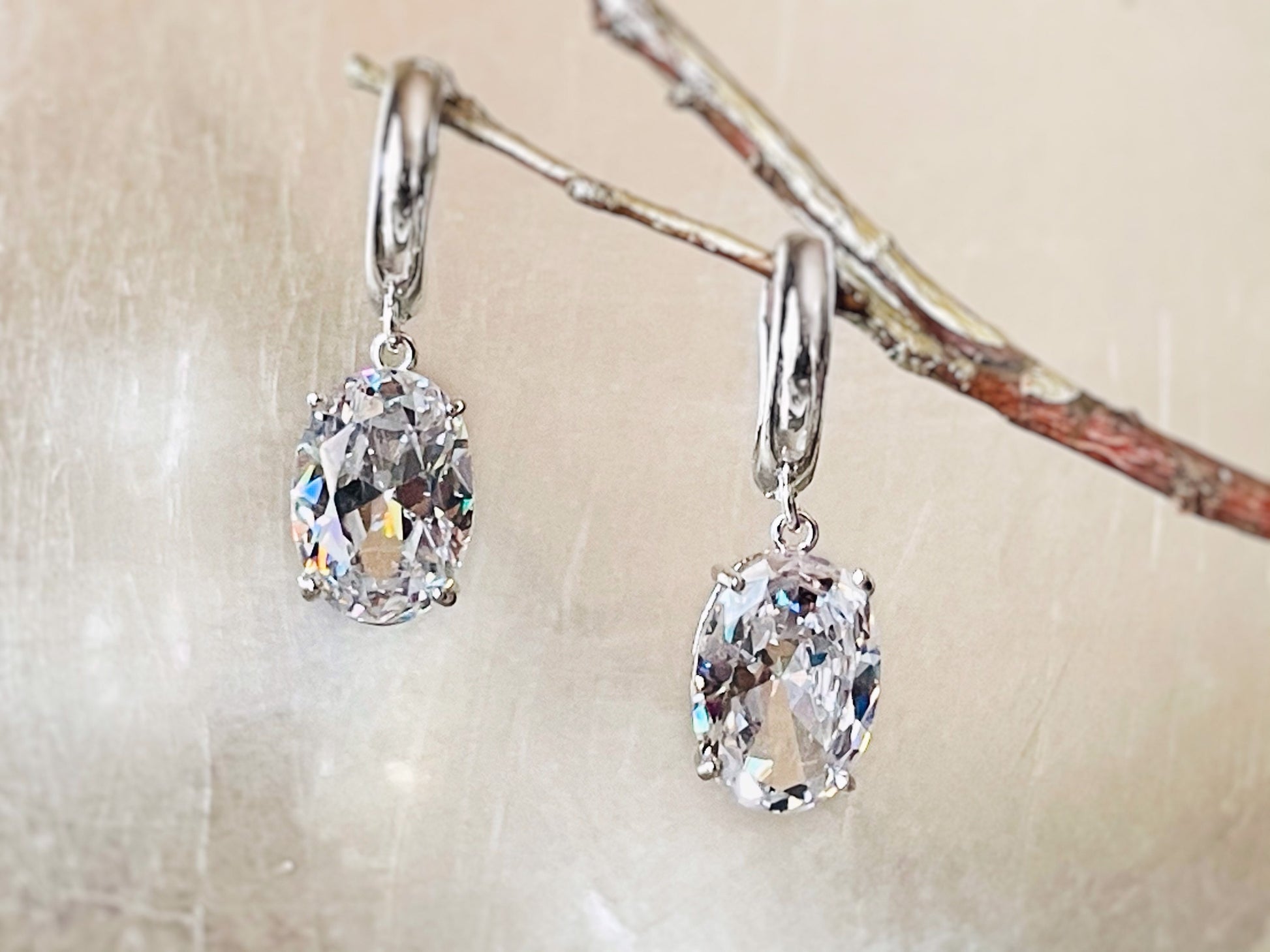 Large cushion cut white dangle earrings set in 14K rose gold, 14k yellow gold or 18K white gold over brass. Each created white sapphire gemstone is 14x10mm. Lead and nickel free.