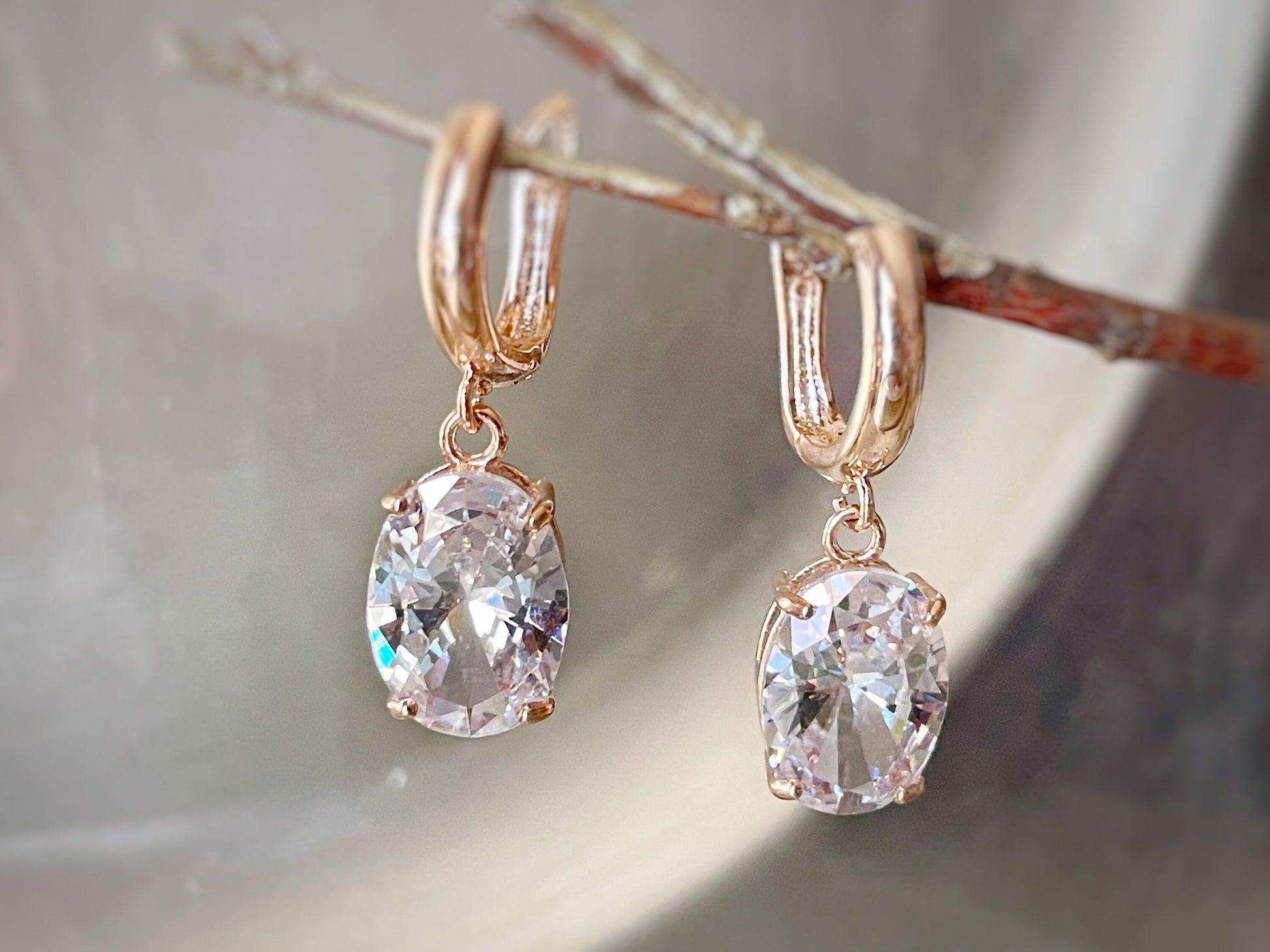 Large cushion cut white dangle earrings set in 14K rose gold, 14k yellow gold or 18K white gold over brass. Each created white sapphire gemstone is 14x10mm. Lead and nickel free.