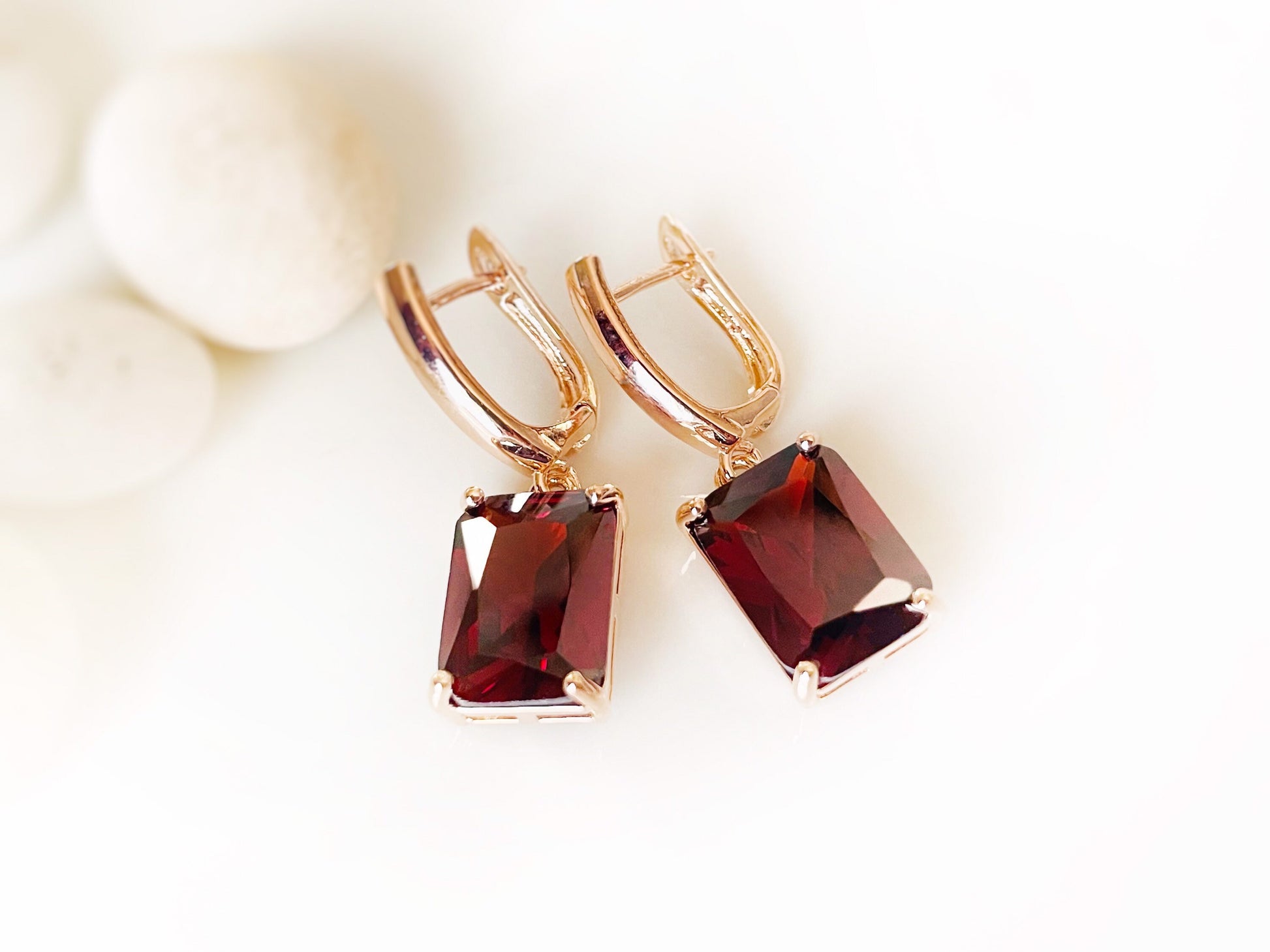 Large emerald cut created garnet gemstone dangle earrings in polished 14K rose gold, 14K yellow gold or 18K white gold over brass, lead and nickel free.