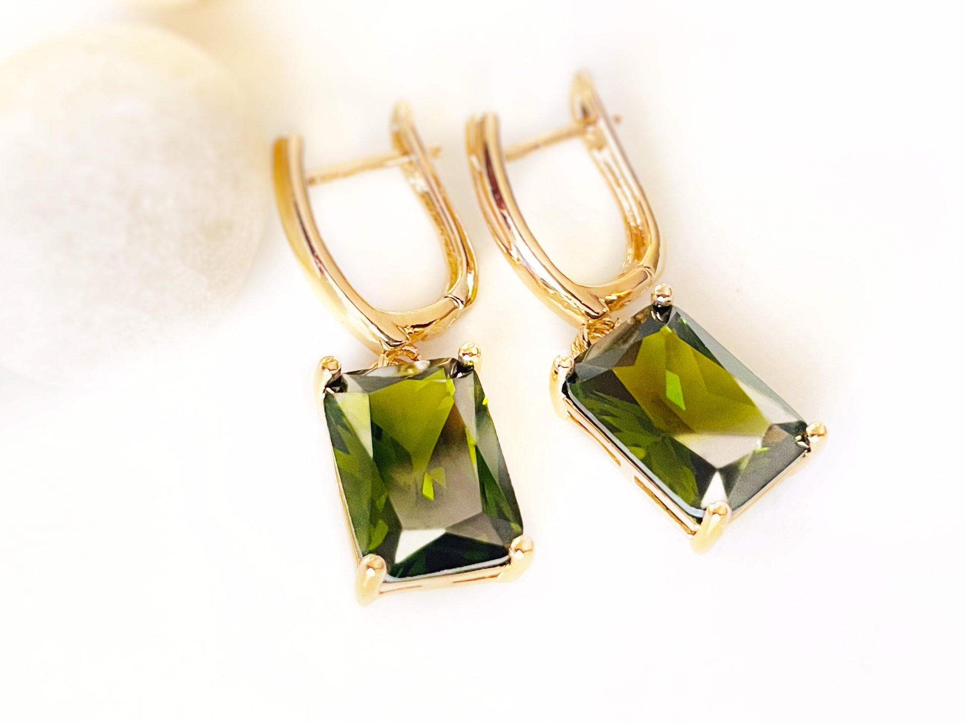 Large emerald cut created peridot dangle earrings in polished 14K rose gold, 14K yellow gold or 18K white gold over brass, lead and nickel free.