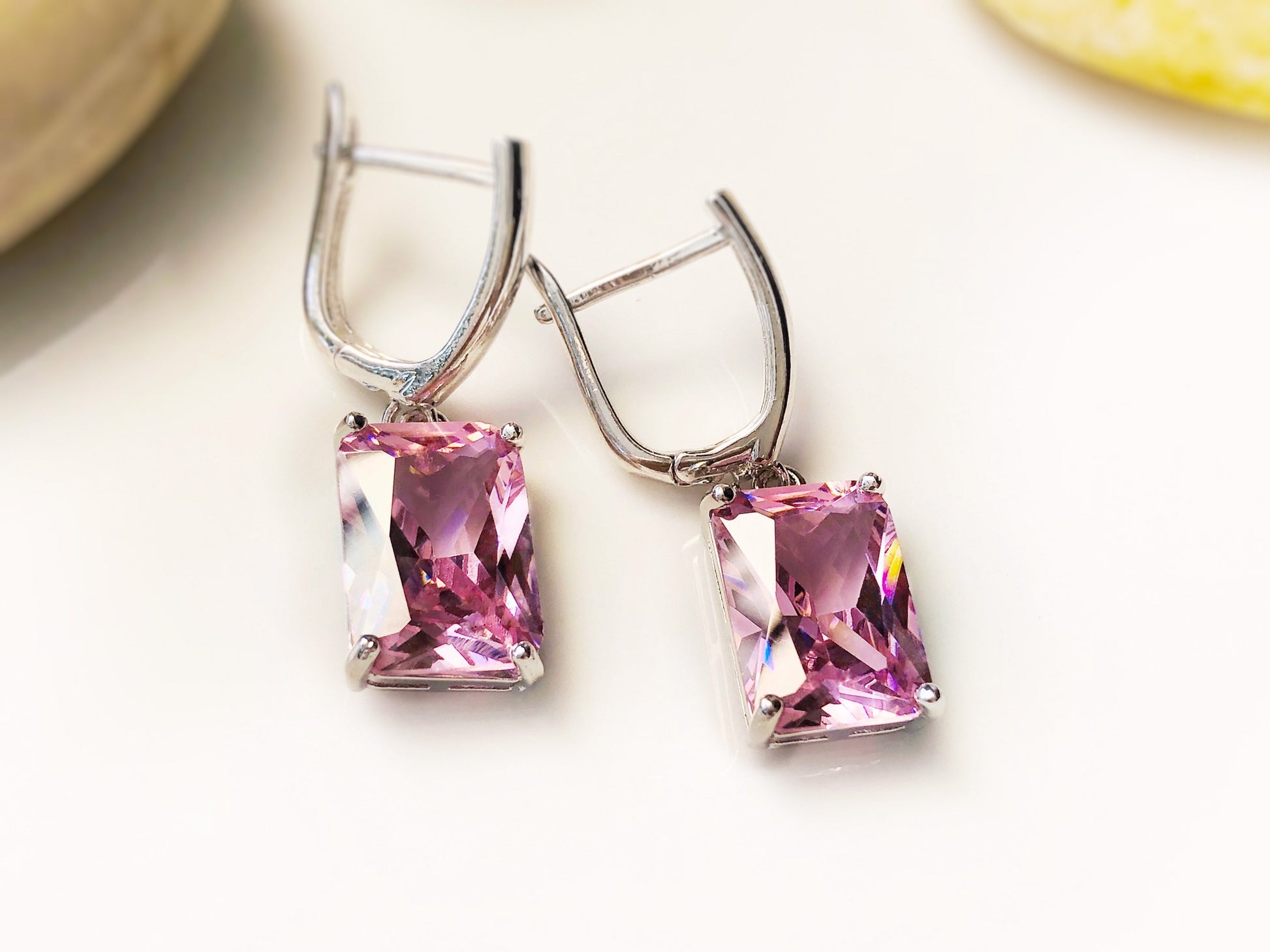 Large emerald cut pink sapphire dangling earring in 18K white gold, pink gemstone earrings, gift for mom, gift for her, October birthstone
