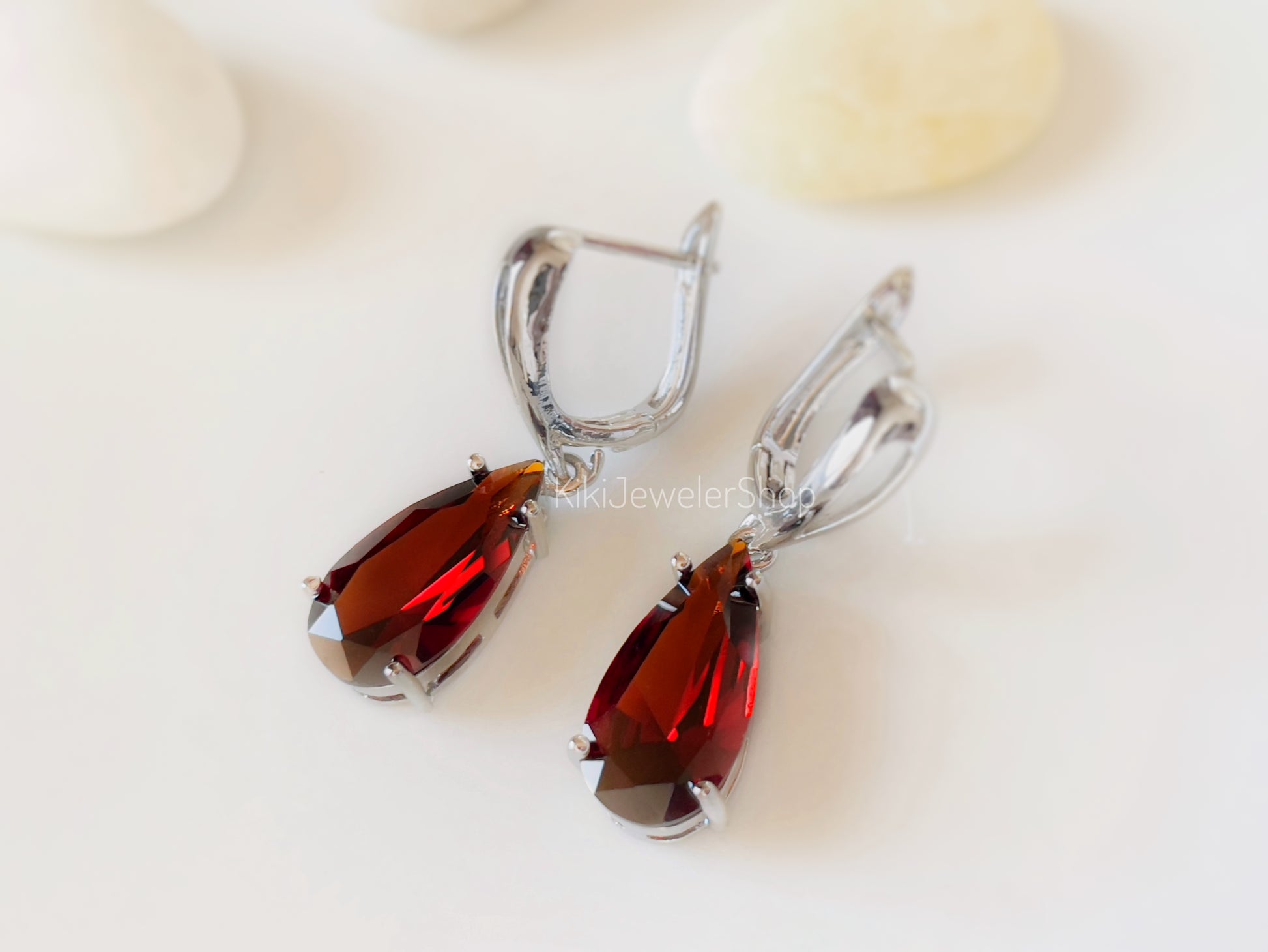 Large teardrop garnet dangle earrings are meticulously crafted from 18k white gold, 14k rose gold, or 14k yellow gold over brass, featuring elongated 18x9mm pear-shaped garnet gemstones. These earrings are free from lead, nickel, and are hypoallergenic.