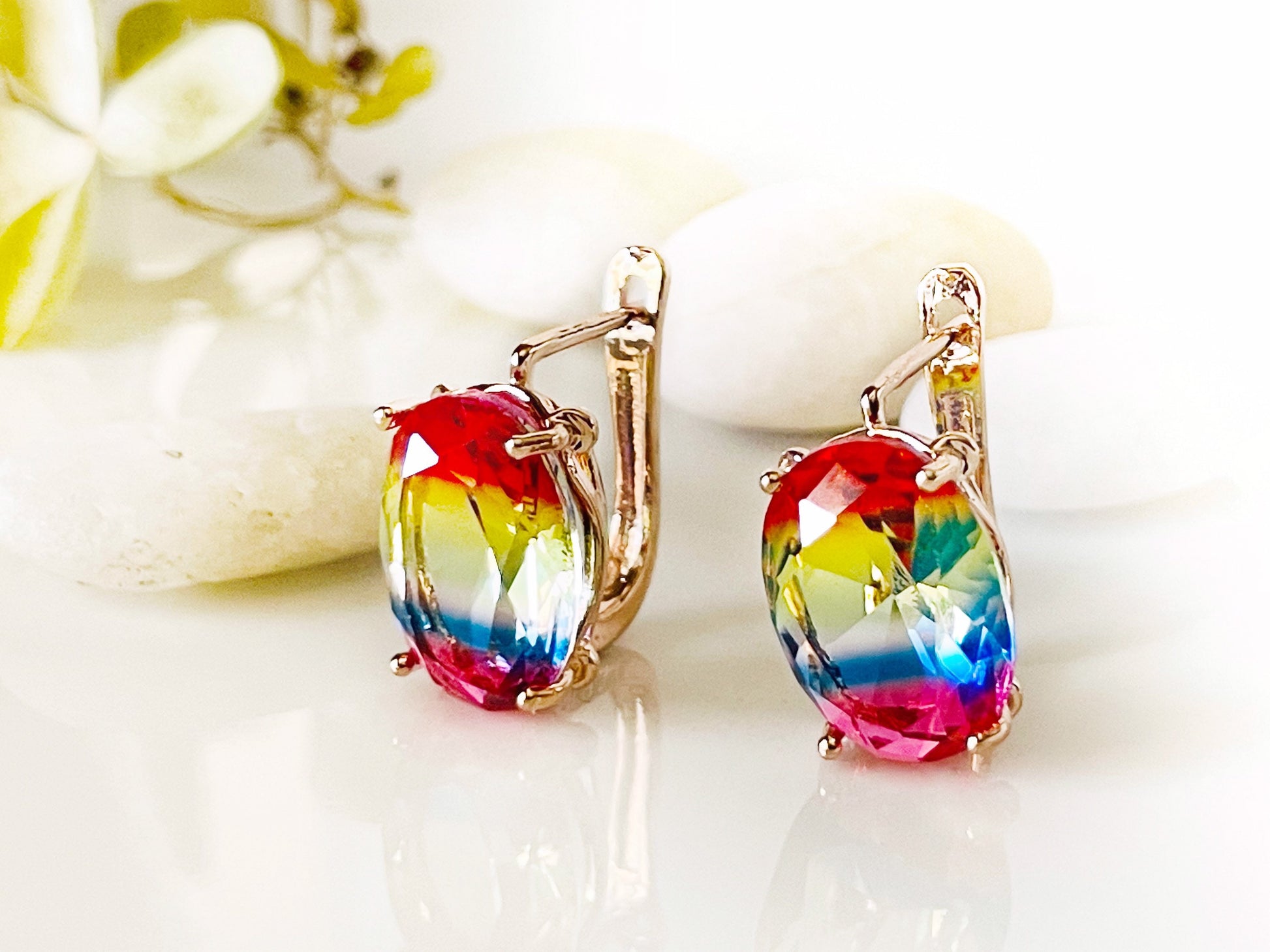 Large cushion cut multicolored stud lever back earrings casted in 14K rose gold plated over brass, specially treated for lead and nickel free, safe for sensitive skin. Each created gemstone is 14x10mm and superbly cut for maximum sparkles with every movement you make.