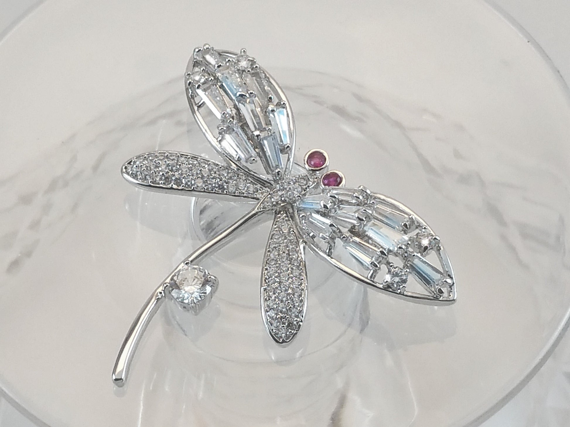 Large pave baguette stones and ruby dragonfly brooch in 18kt white gold rhodium, gift fo her, gift for mom