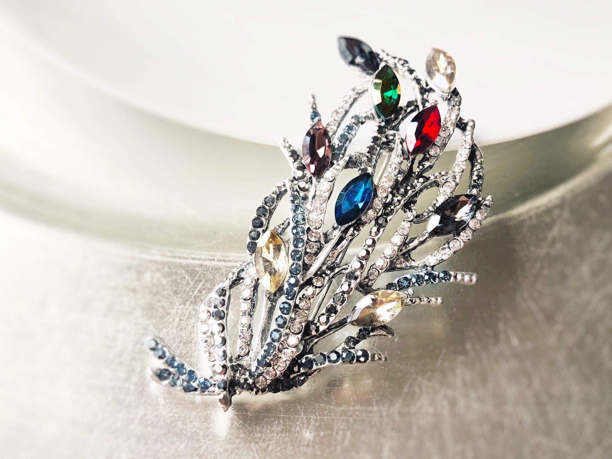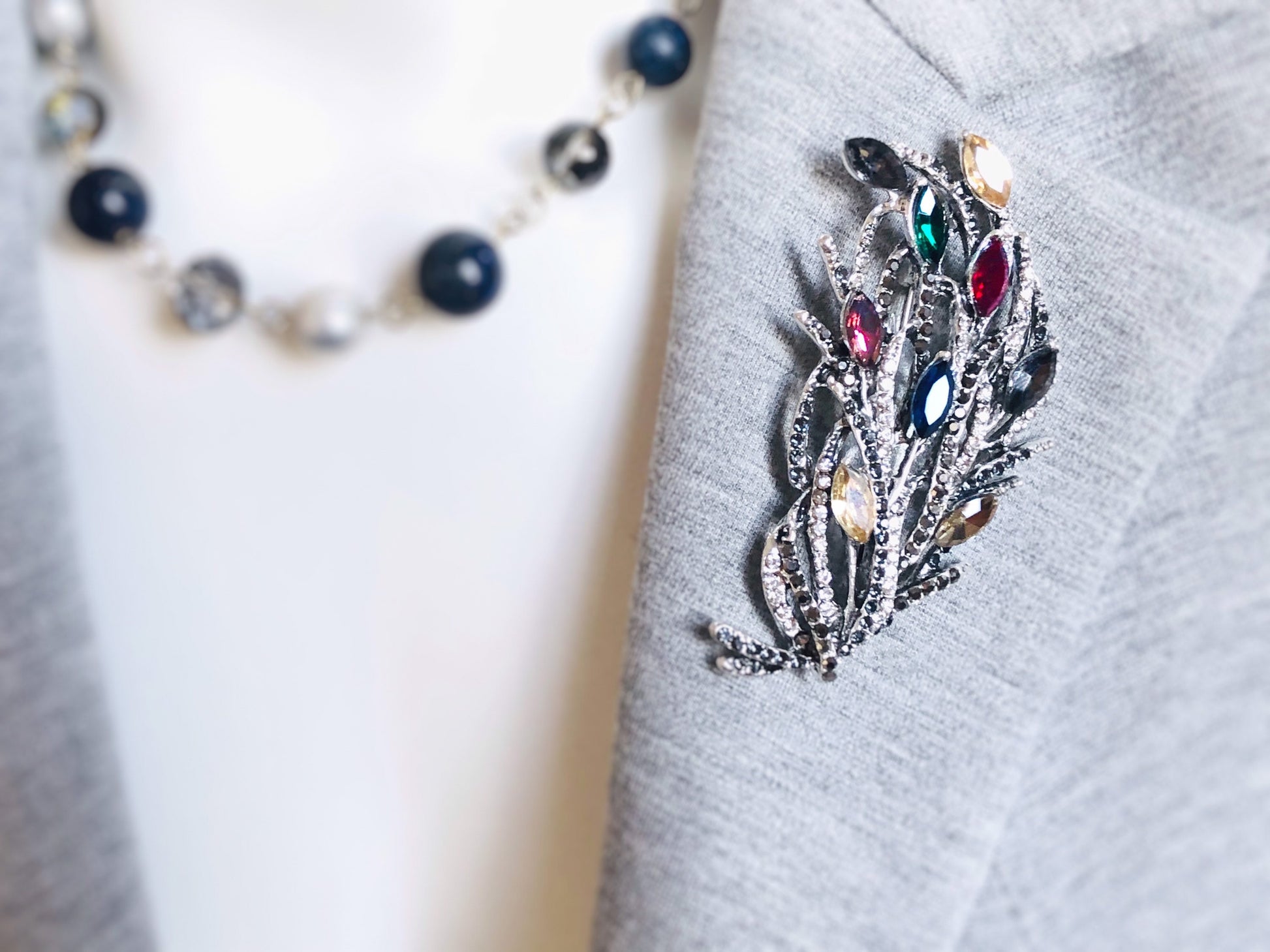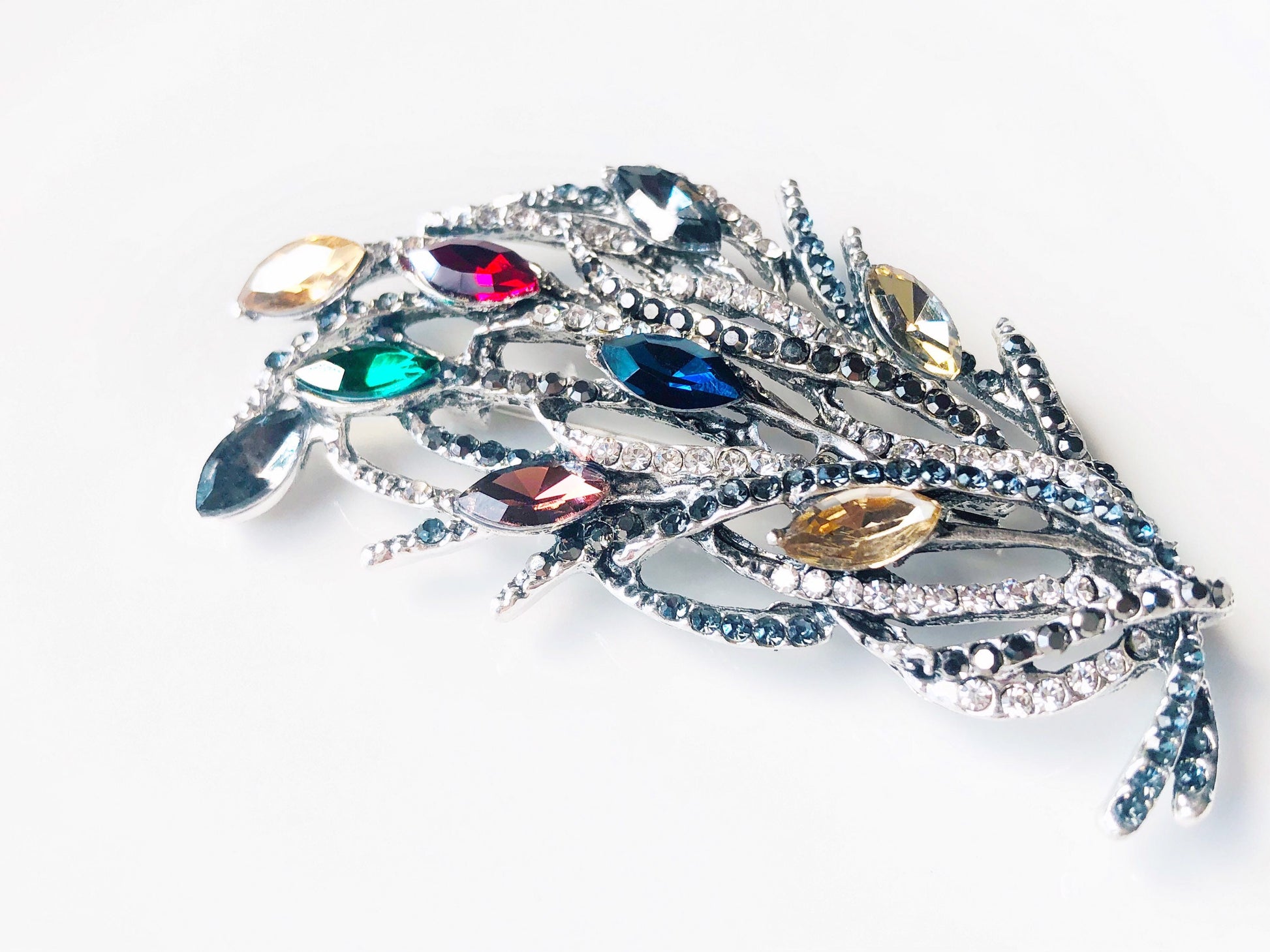 This beautiful statement brooch is designed to resemble a feather. It’s casted in silver encrusted with dark blue, black and white faceted crystals with random placement of larger multi color marquee cut crystals.