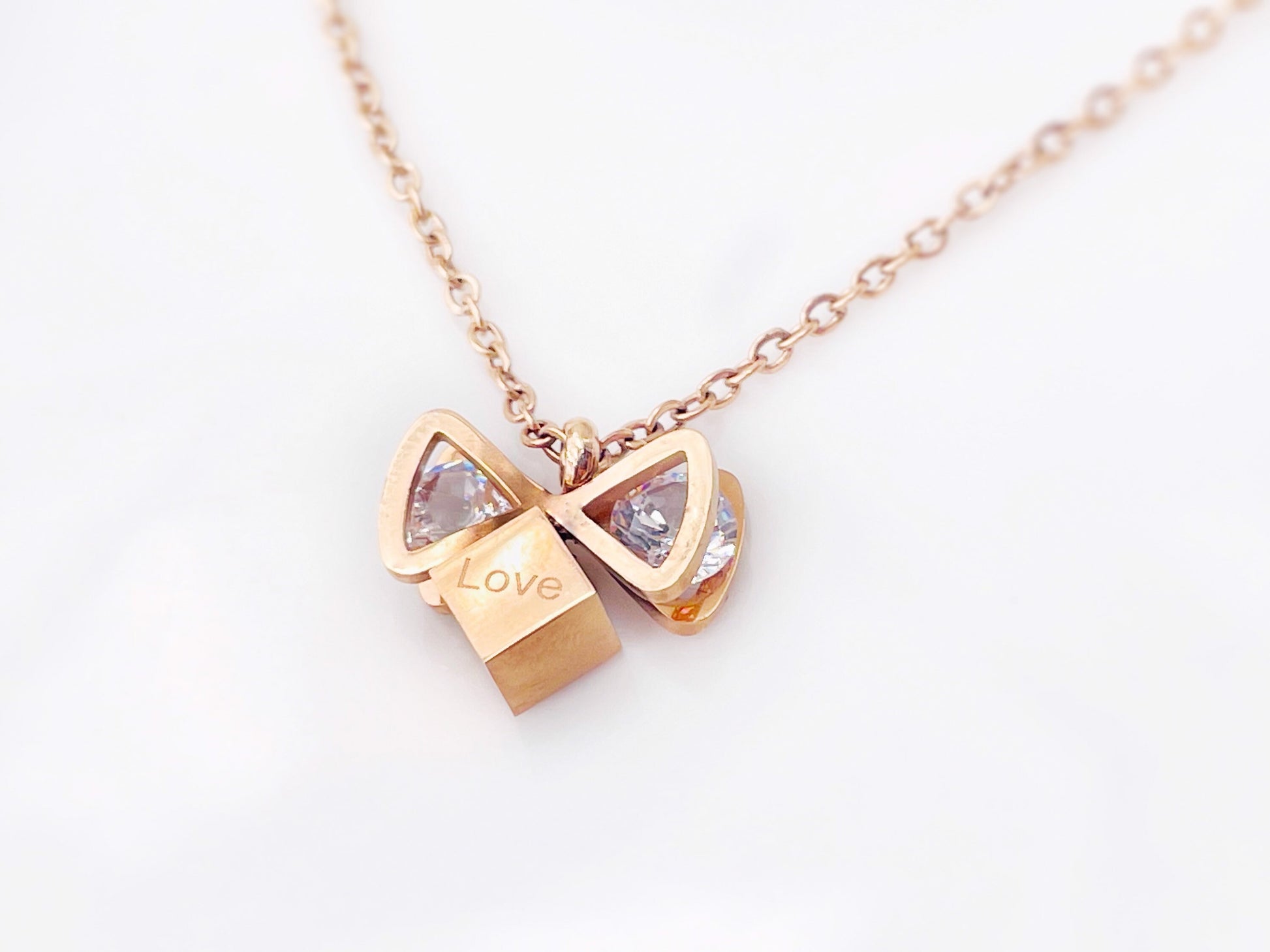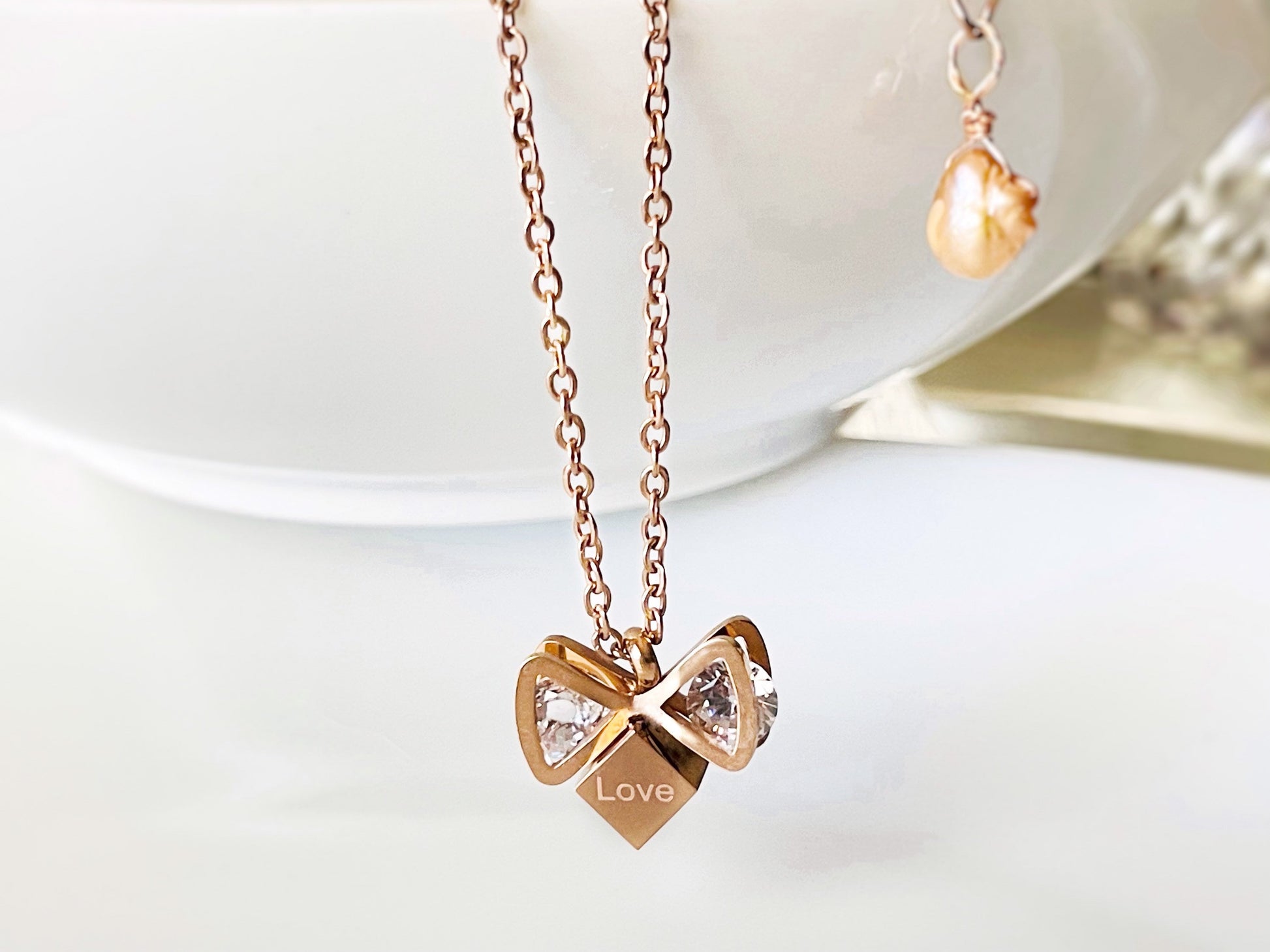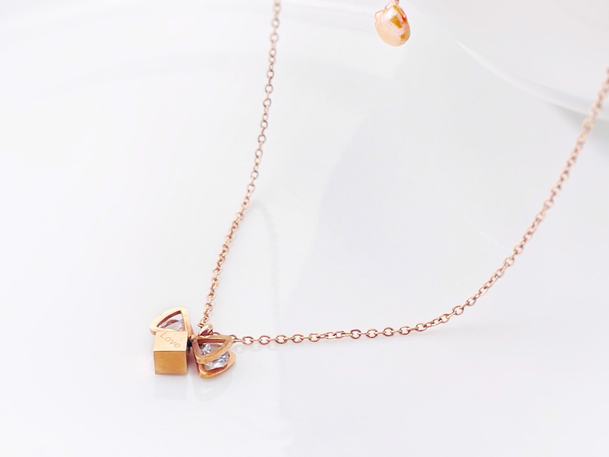 “LOVE” pendant necklace with 2 (5mm”, 1/2 ct) lab created white sapphire casted in 18K rose gold filled. This necklace is made of the highest quality materials. Perfect Valentine’s Day gift for someone special, or self love!
