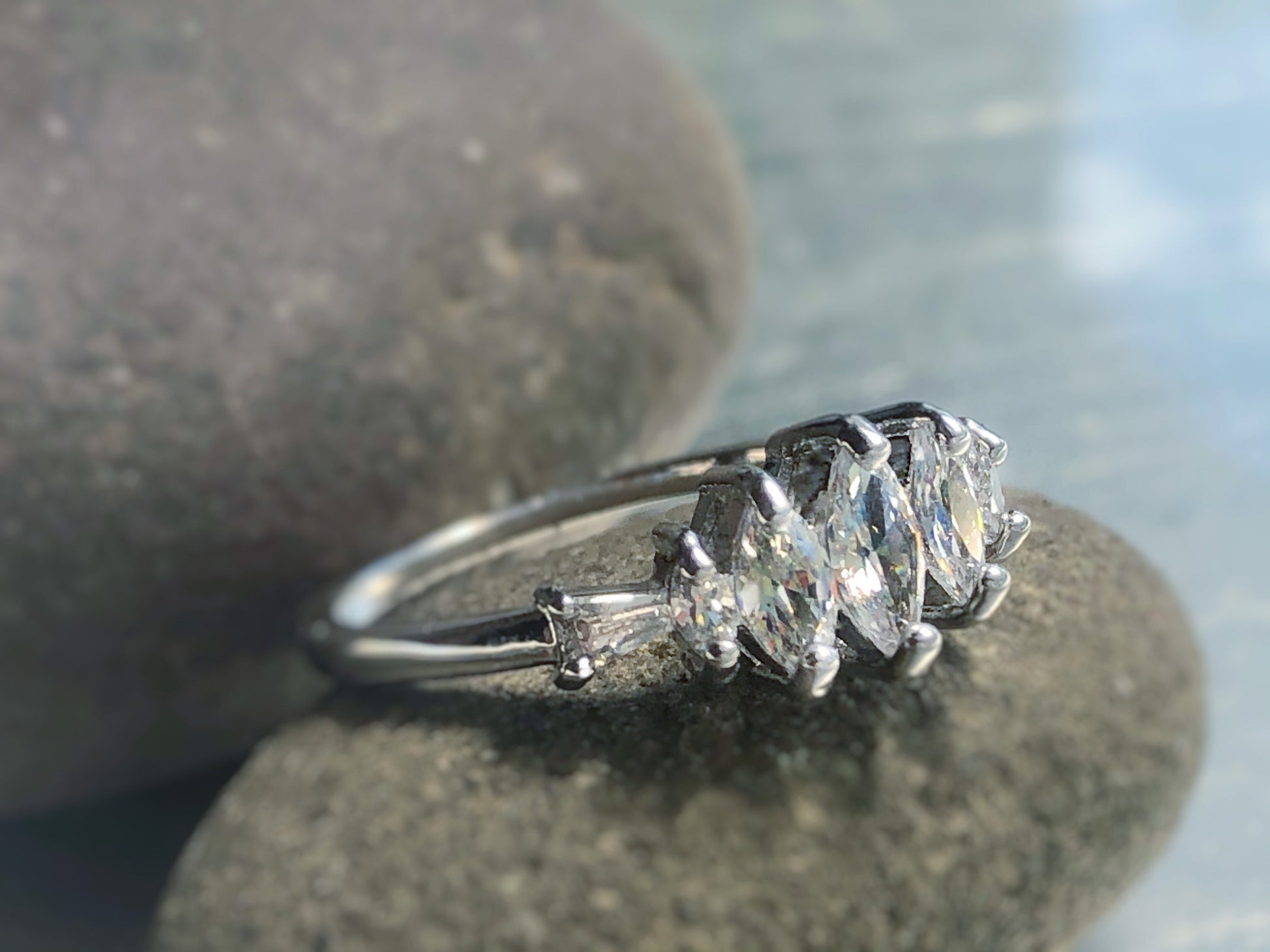 This beautiful Ring features a row a marquis cut lab created white sapphire stones in different sizes wedding ring. It is set in 18k white gold rhodium to prevent tarnish