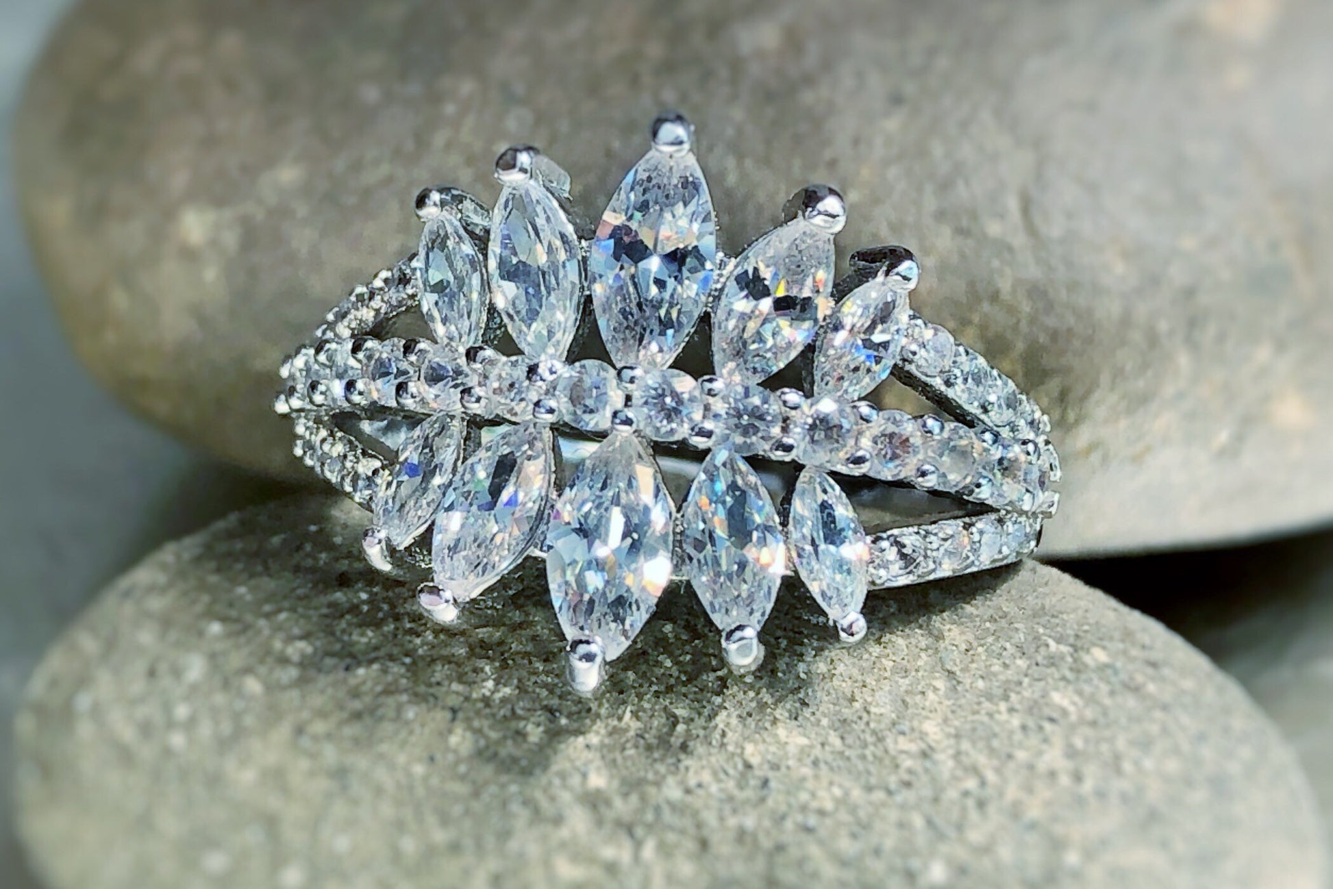 This super sparkle statement/cocktail ring with lab created white sapphire stones set in 18k white gold rhodium.