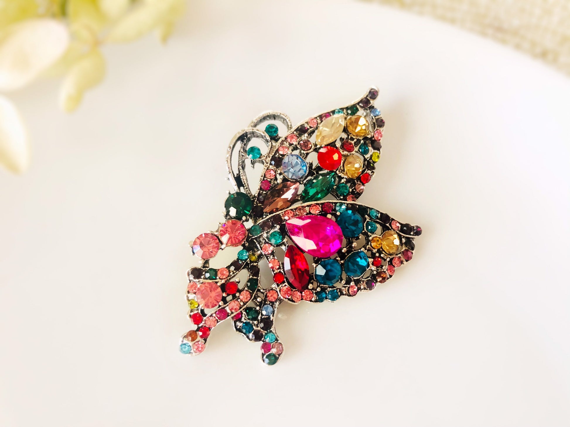 Beautiful multicolored crystal encrusted butterfly brooch in antique silver is a statement maker of any outfit in any occasion! The crystals come in different size and colors. This amazing can also be used as a pendant.