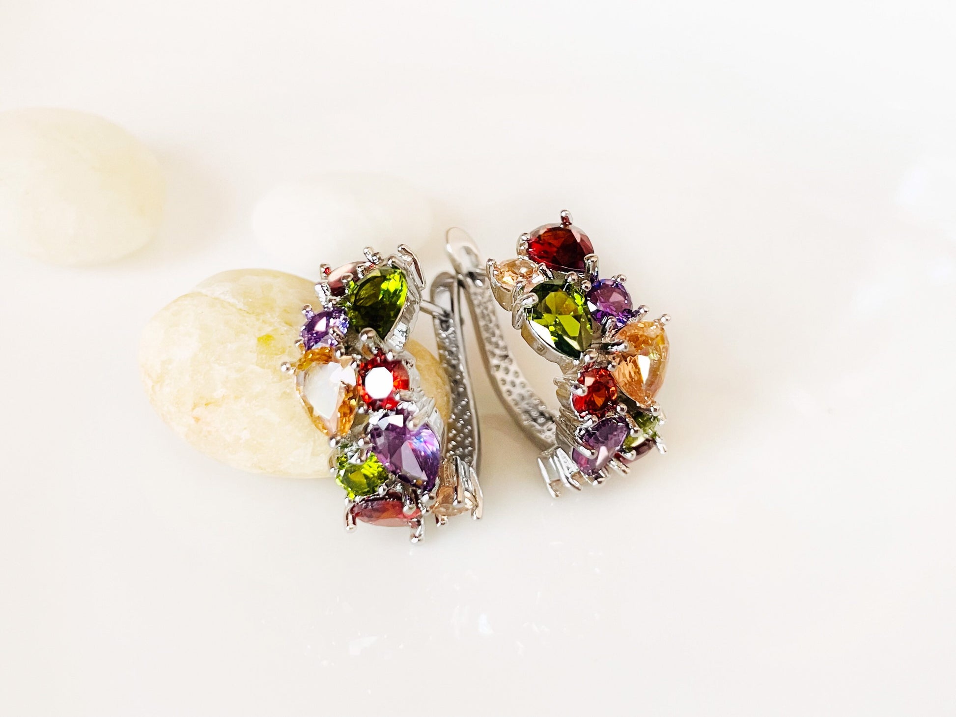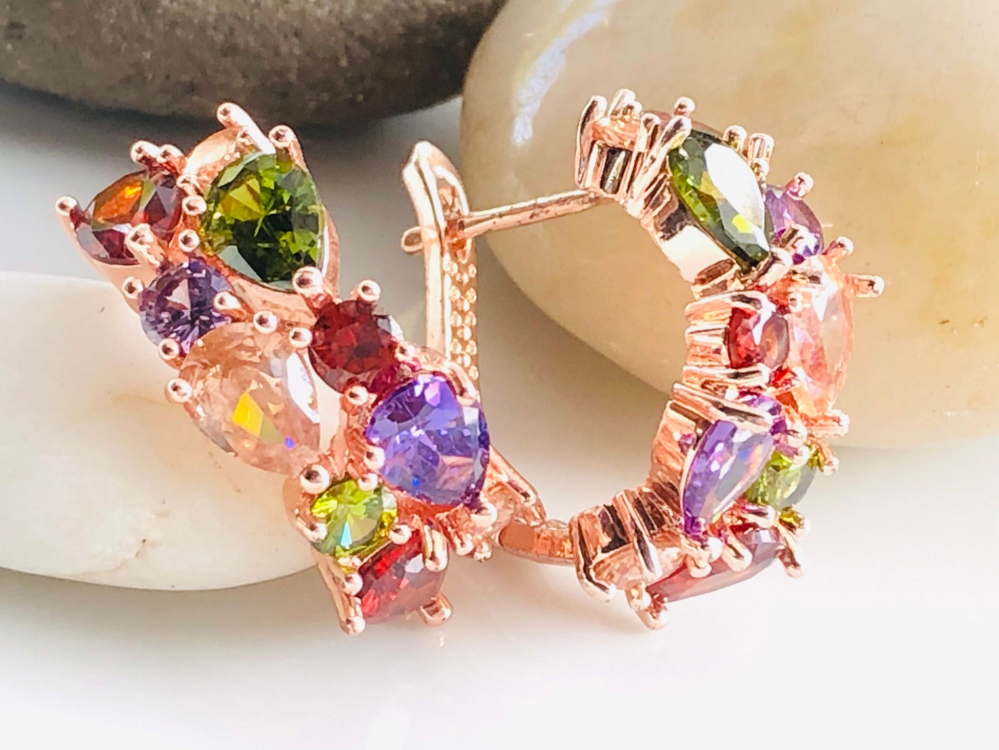 Multicolor CZ gemstones hoop earrings crafted 14K rose gold or 18K white gold plated over brass. Rainbow color gemstone statement earrings will instantly spruce up your outfit.