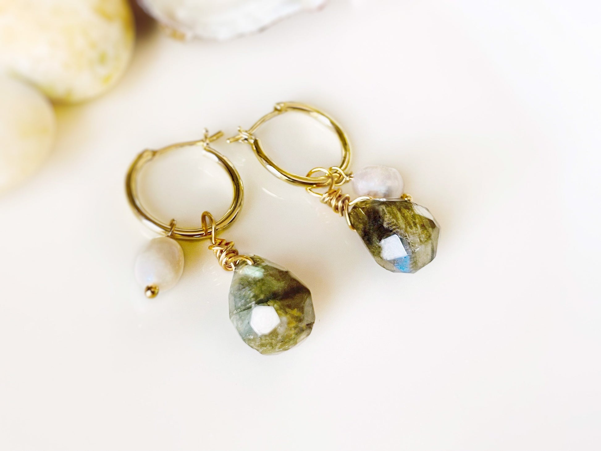 Natural labradorite gemstone faceted teardrop (15x10mm) and 7x5mm freshwater pearls wired wrapped and dangle from 18mm (0.75”) hoops in 14K gold filled over brass. Lead free and allergy free.