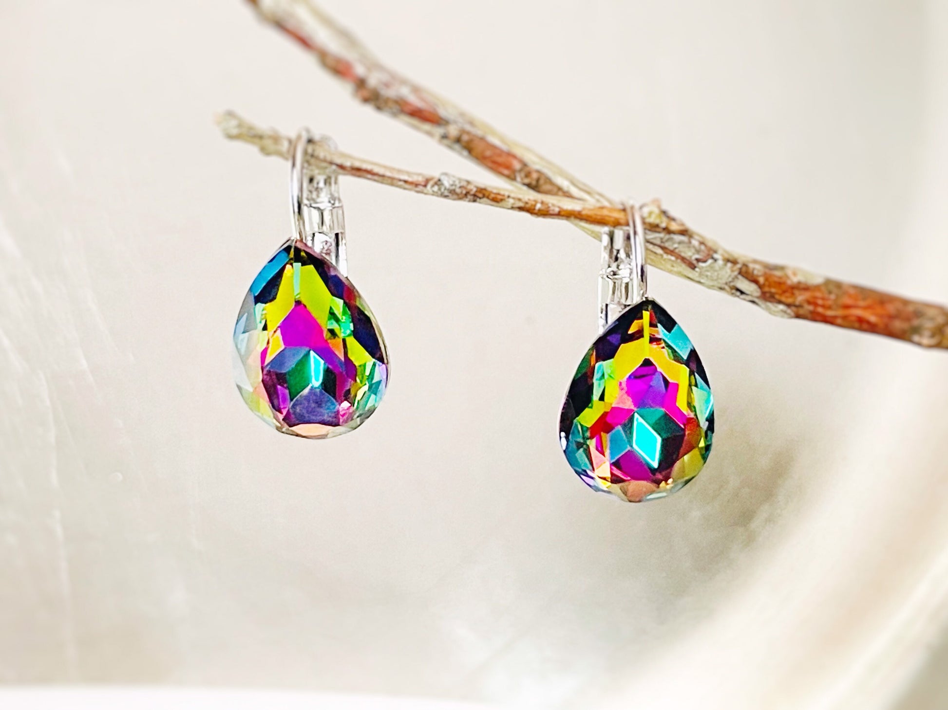 These beautiful earrings feature two fancy Crystals mimics the natural colors in peacock feathers, sparkling with rich shades of dark green, sea blue and hot pink. To create this exclusive product, the crystals are shipped to a third-party vendor where they receive a transparent custom coating to add shimmering translucent color. This process results in a beautiful range of reflective colors that may vary from rhinestone to rhinestone. They sparkle with different color with every movement.
