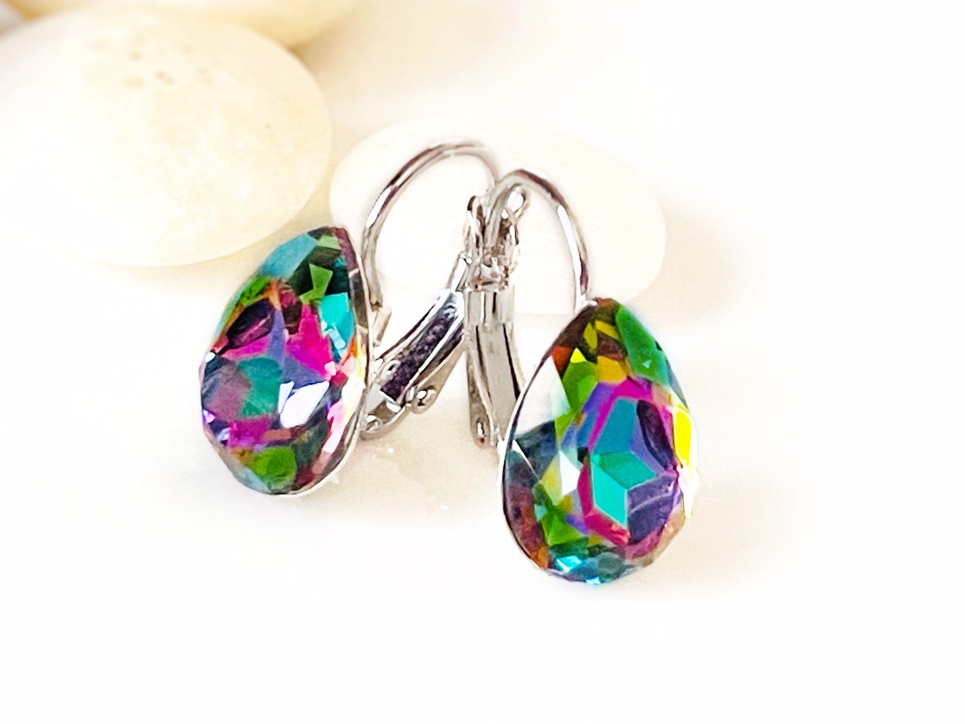 Peacock fancy crystal solitaire lever back earring in white gold, fancy green pink Crystal studs, gift for mom,