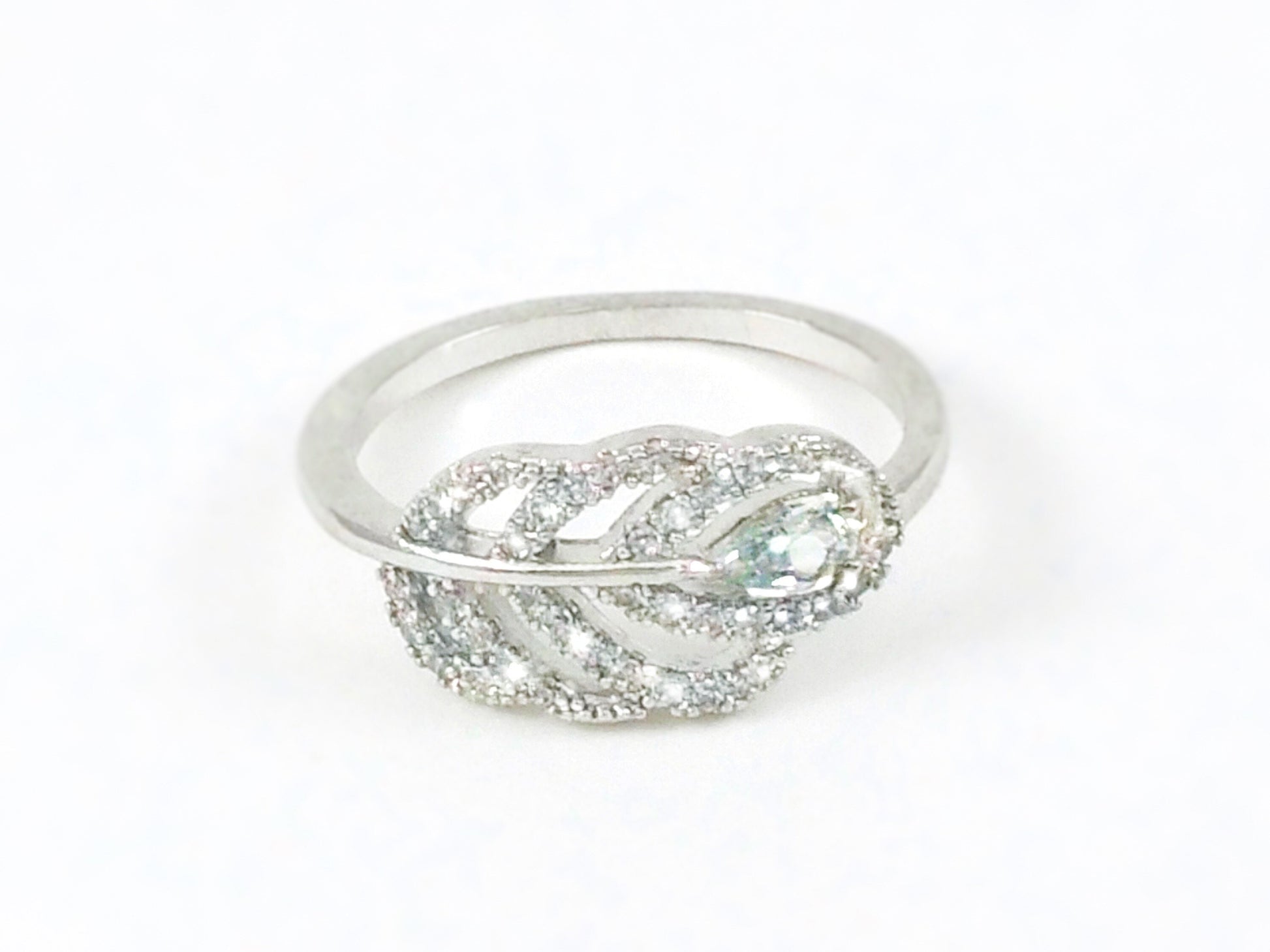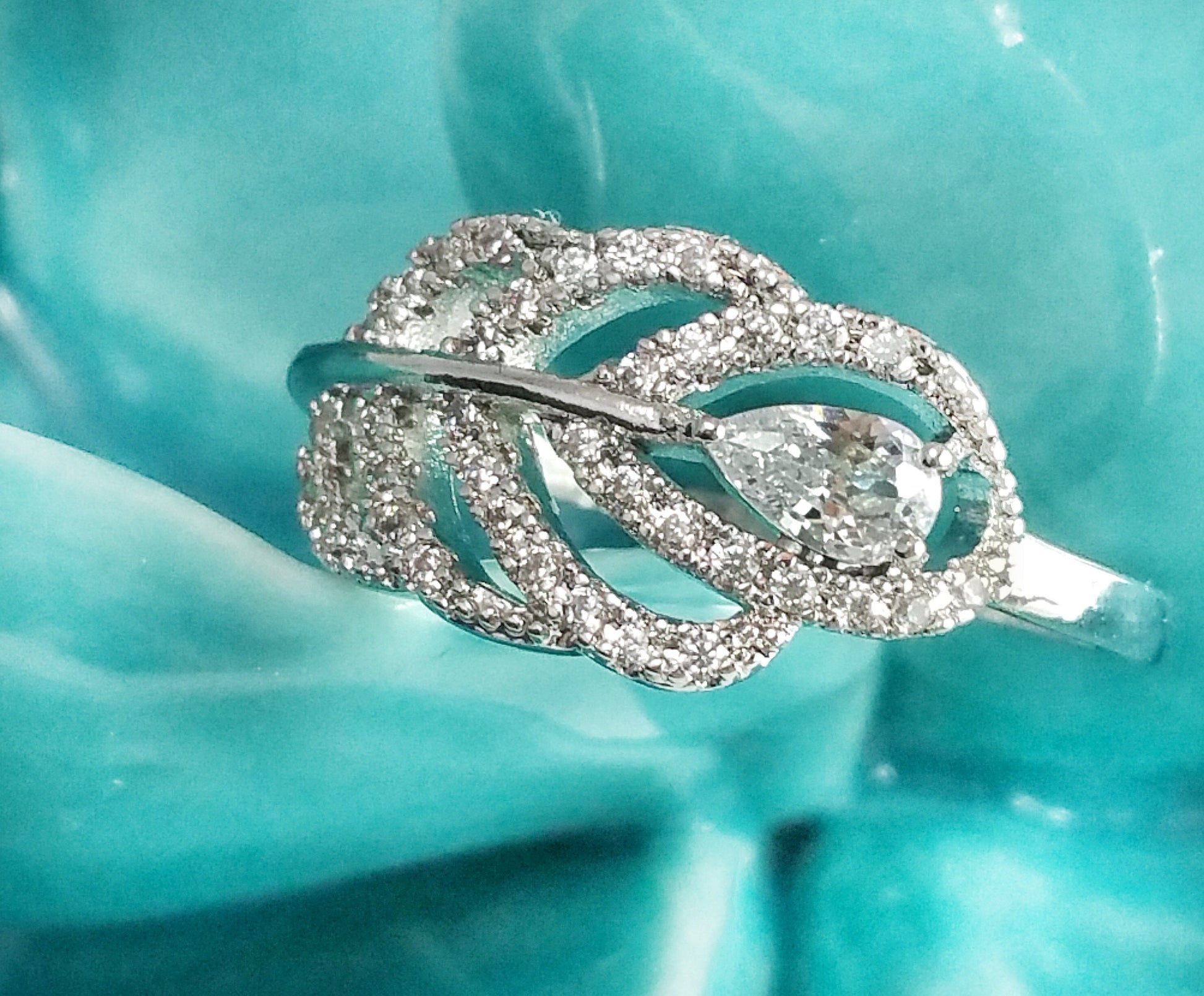 This beautiful dainty ring leaf shape with sparkle pear cut center lab created white sapphire stone statement/cocktail ring set in 18k white gold rhodium.