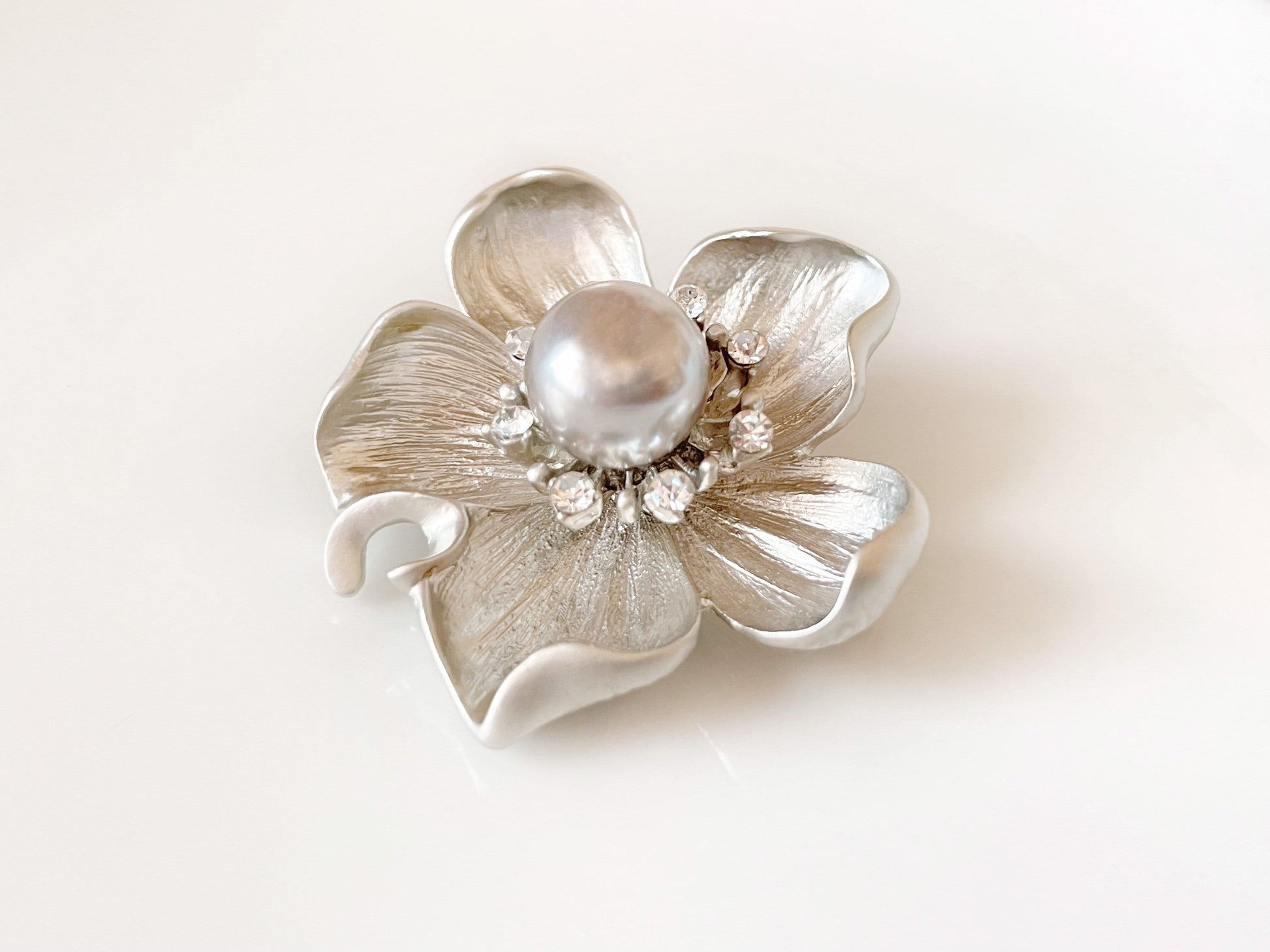 Beautiful three dimensional magnolia flower silver plated brooch with a large grey pearl (13mm) surrounding by clear crystals. This gorgeous bouquet brooch pin makes a festive finishing touch to every outfit.