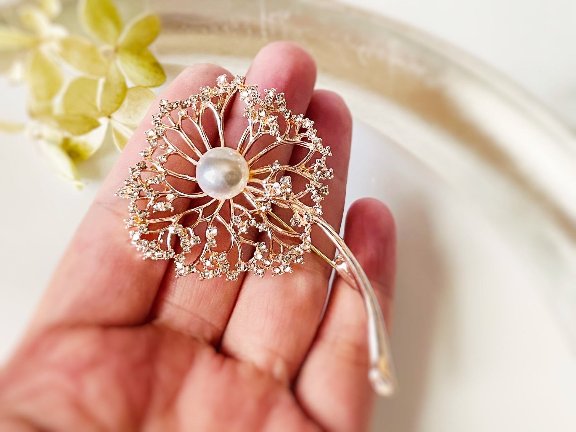 Pearl crystal flower brooch pin rose gold, crystal dandelion wedding brooch, gift for her, gift for mom