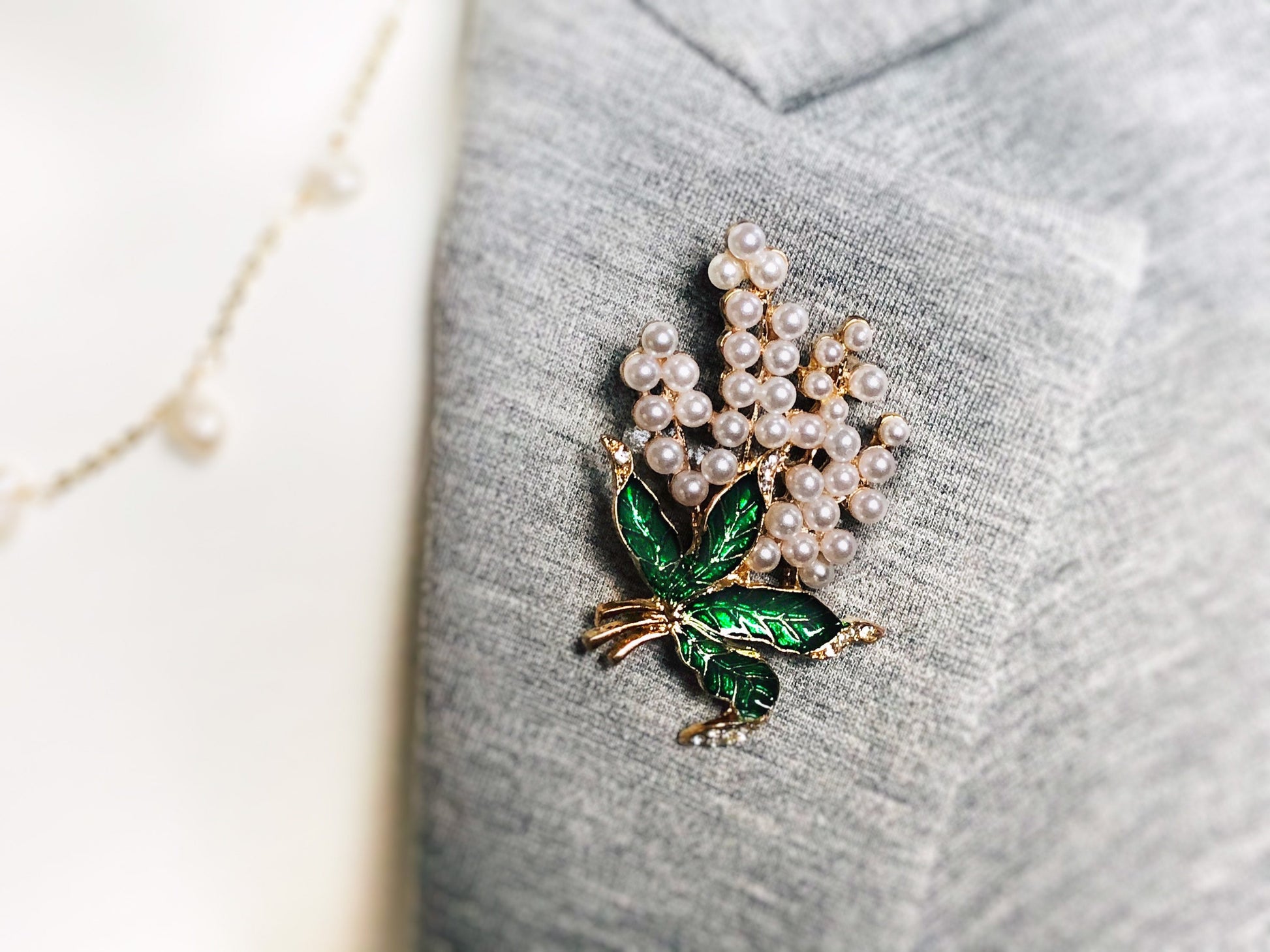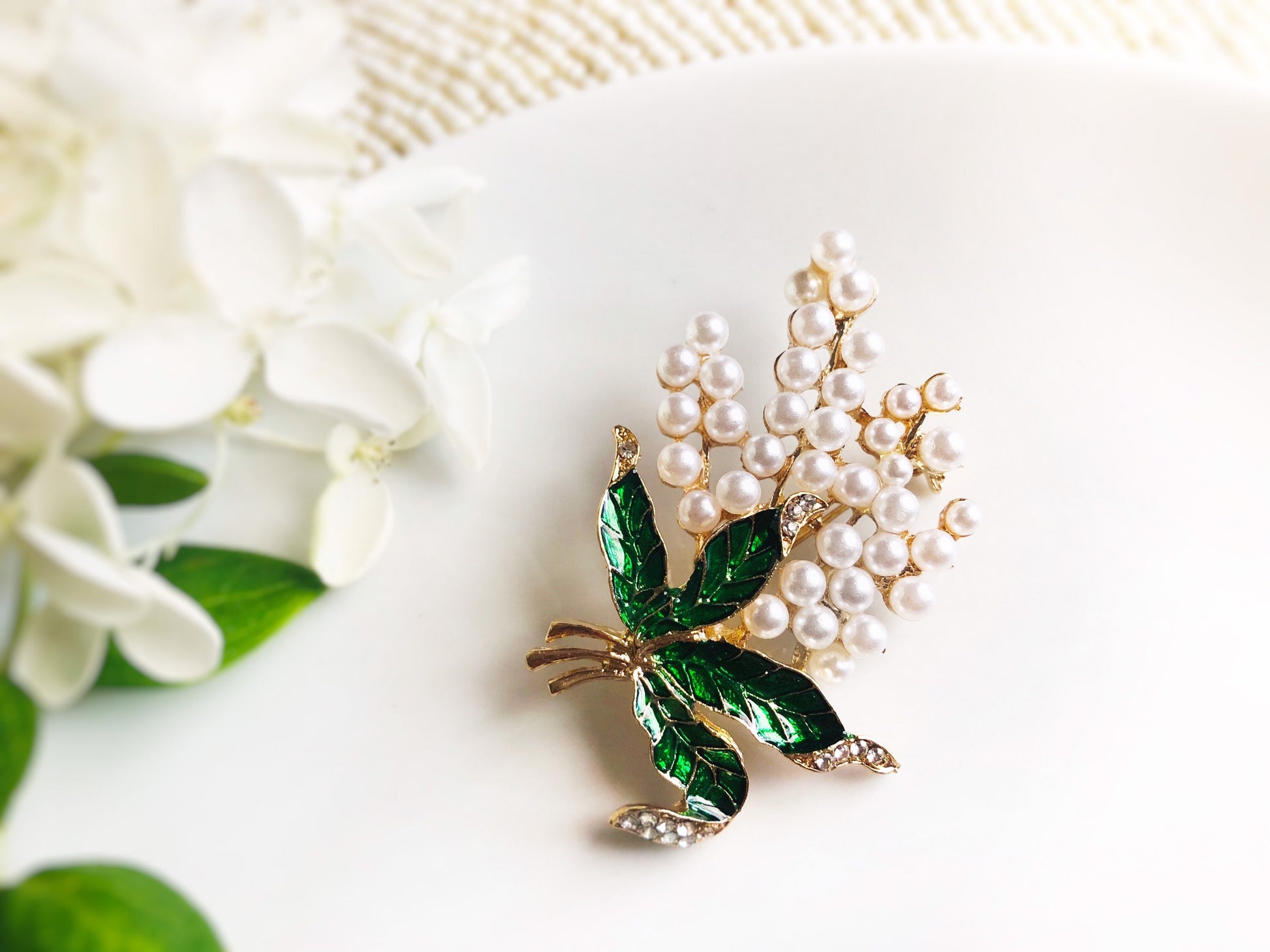 Pearl crystal flower brooch pin, white and green wedding bouquet brooch, wedding bouquet pin, gift for her, gift for mom