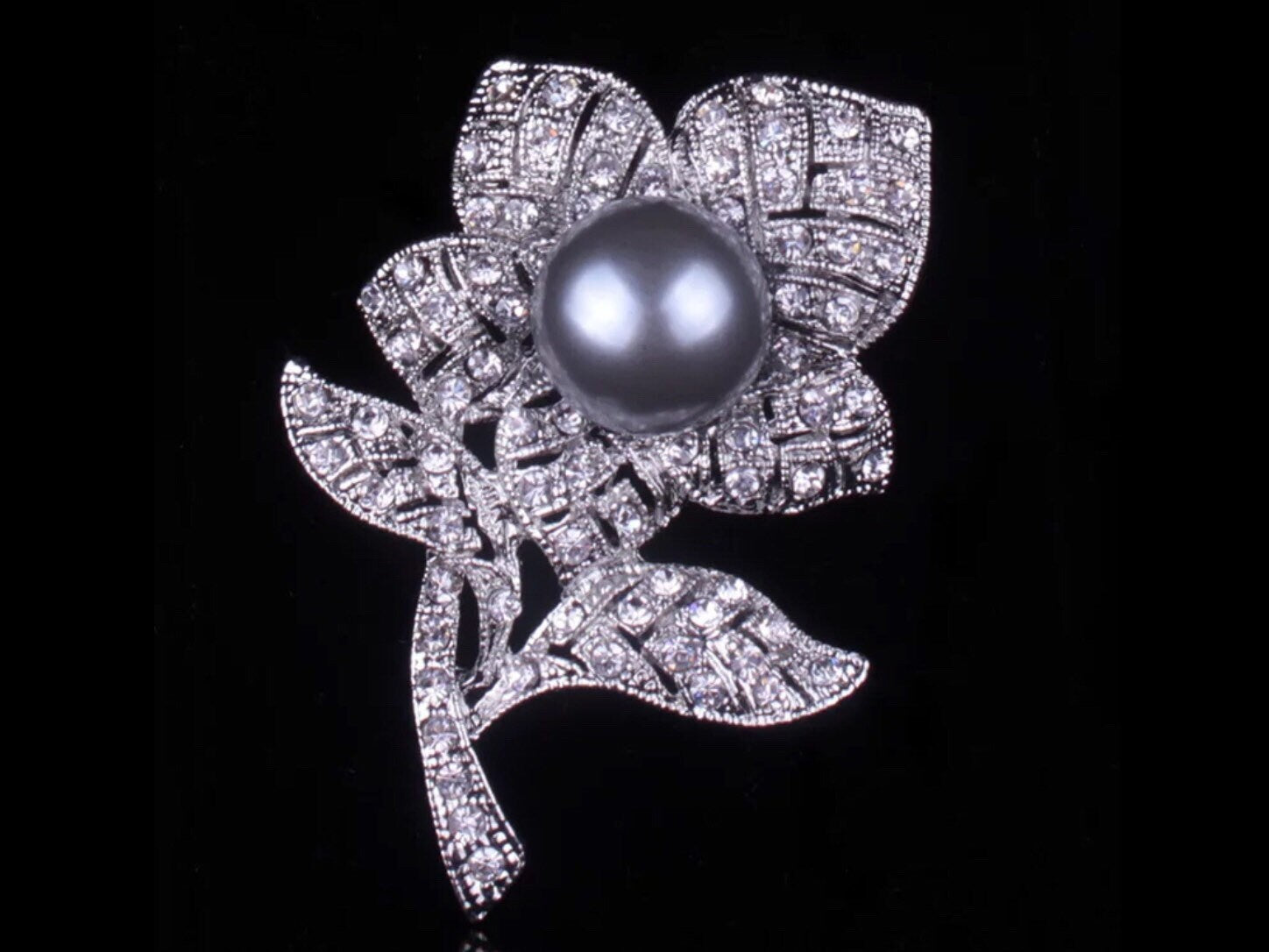 The perfect accessory for the holiday season! Presenting a beautiful display of large 14mm pearls and pave crystals set in 18K white gold plated. This gorgeous flower brooch pin makes a festive finishing touch to every outfit.