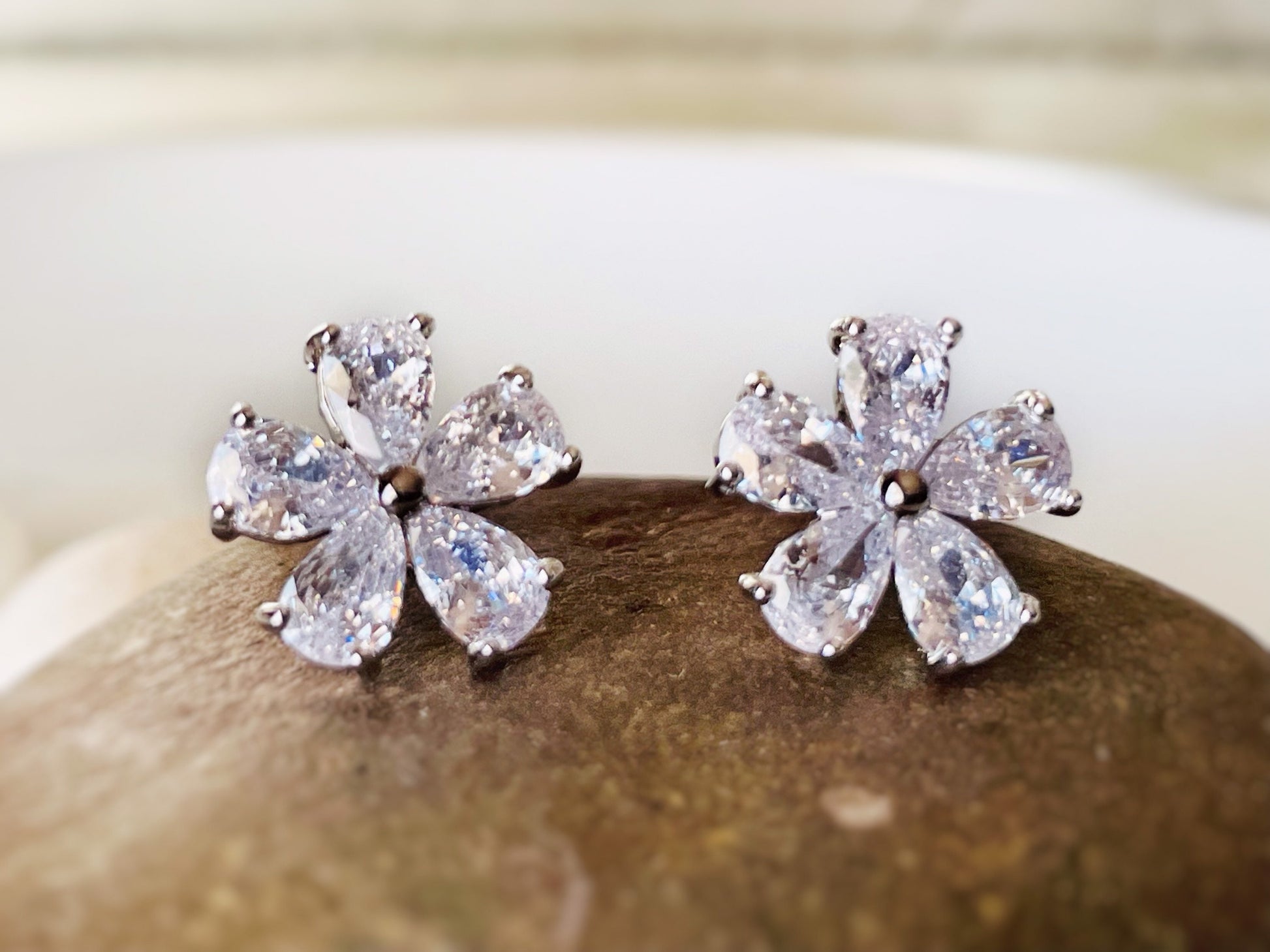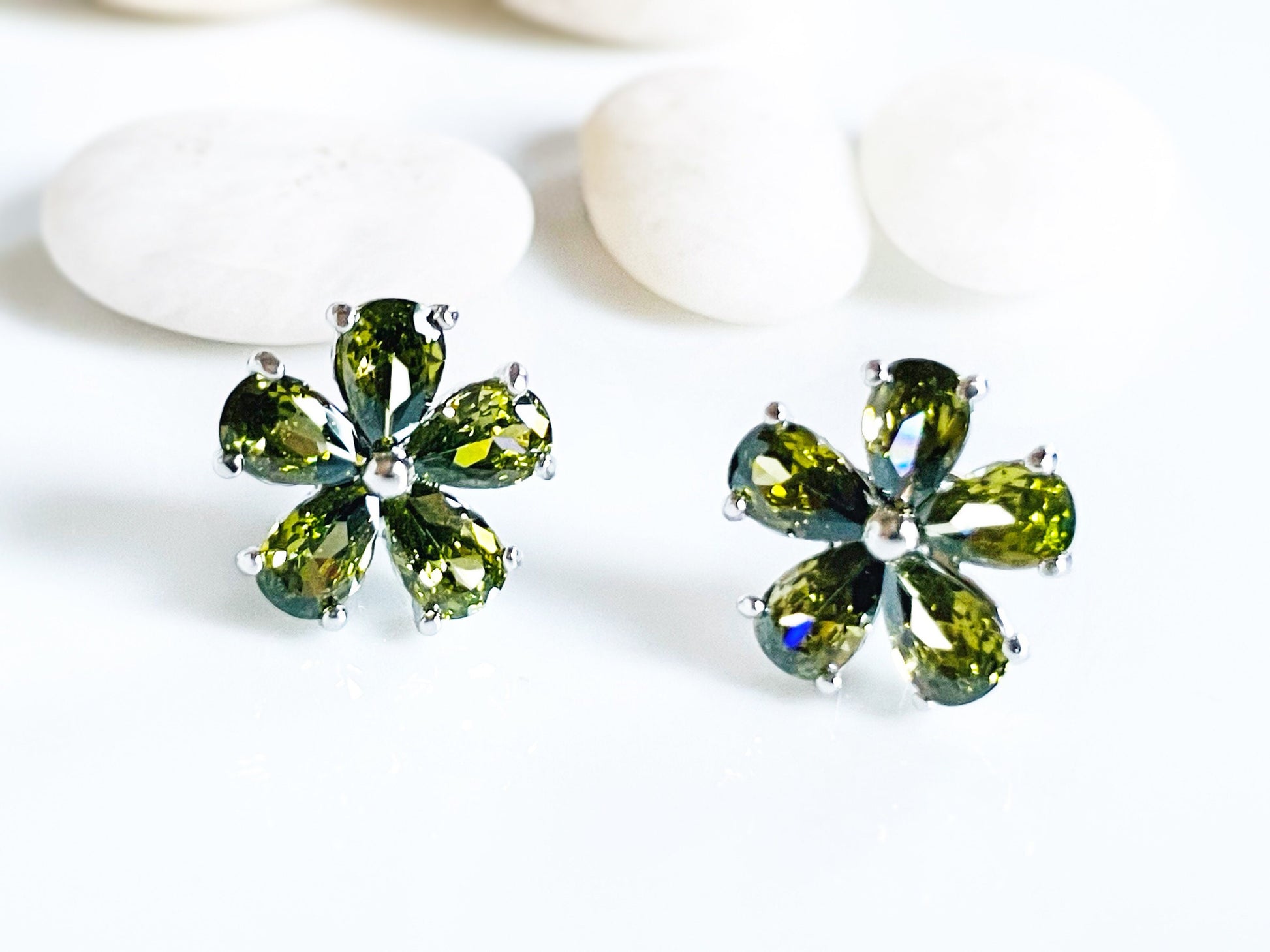 Peridot flower stud earrings set in 18k white gold over brass. These 5 petal pear shaped created peridot gemstones cluster are 14mm / 0.6” in diameter. Light weight and very sparkly. Lead and nickel free.
