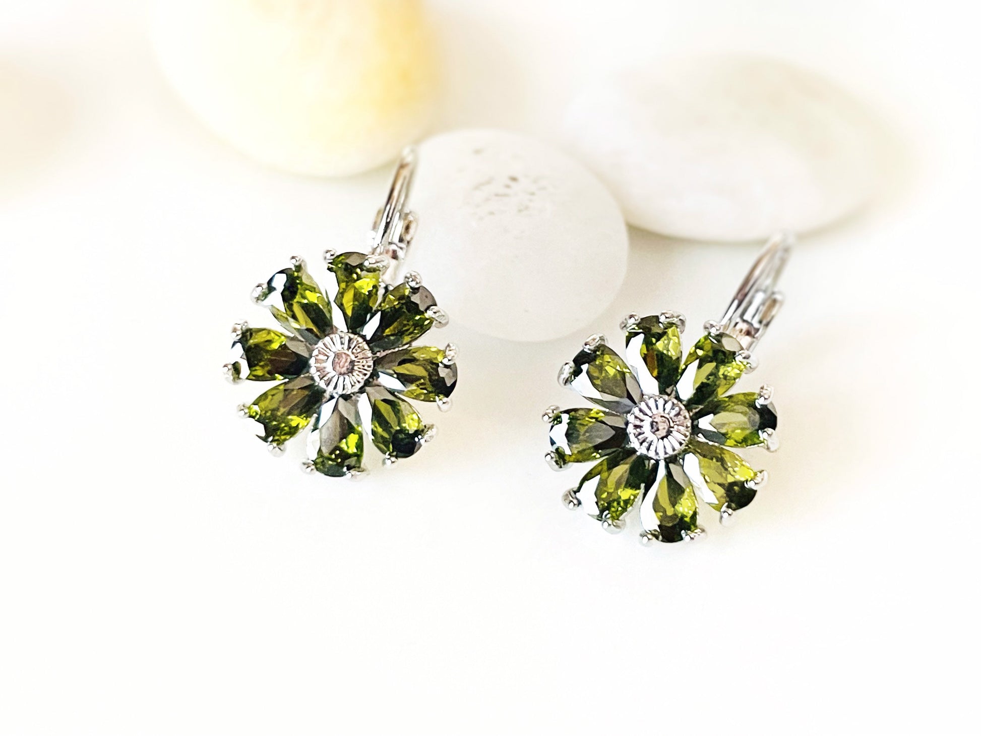 Peridot daisy flower stud earrings with 925 sterling silver post. Each flower has 8 faceted pear shaped created olive green gemstones crafted in 18K white gold, 14K yellow gold, or 14k rose gold* (huggies) plated over brass. Each daisy flower is 13mm / 0.5 inch in diameter. Lead and nickel free.