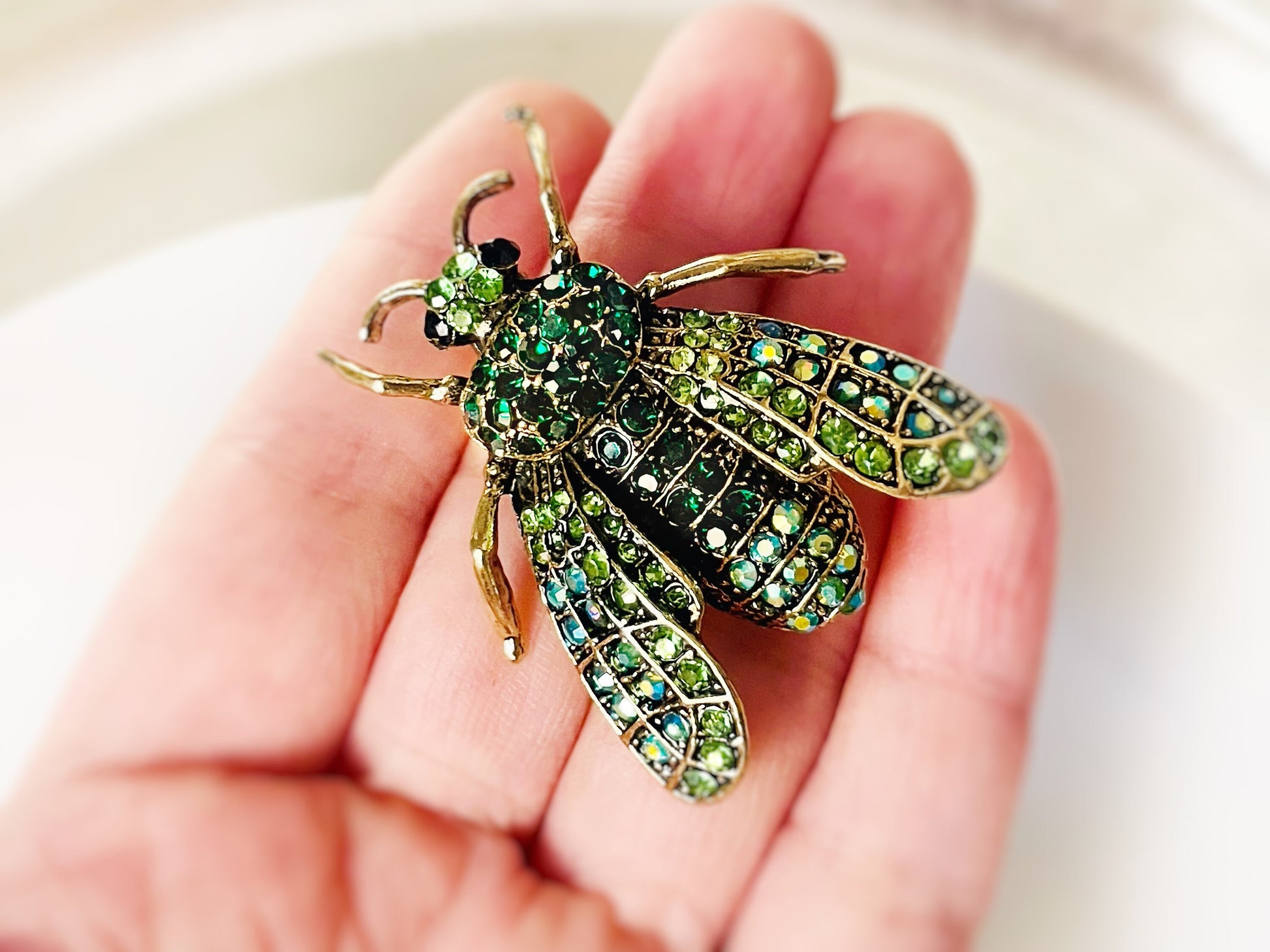 Peridot green crystal bee brooch antique gold, green crystal animal pin, statement crystal bee brooch, gift for her, gift for mom