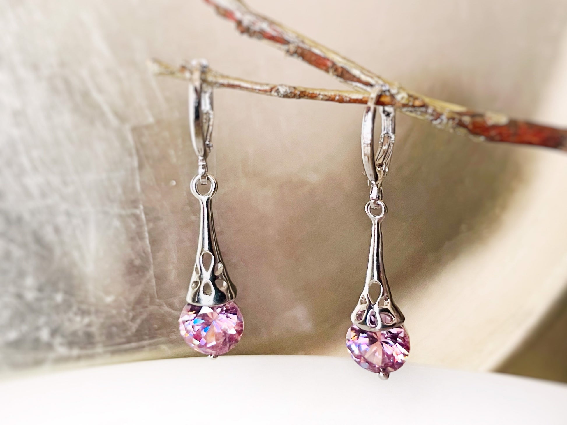 Pink sapphire filigree dangle earrings, small pink gemstone drop earrings, gift for her, gift for daughter, October birthstone